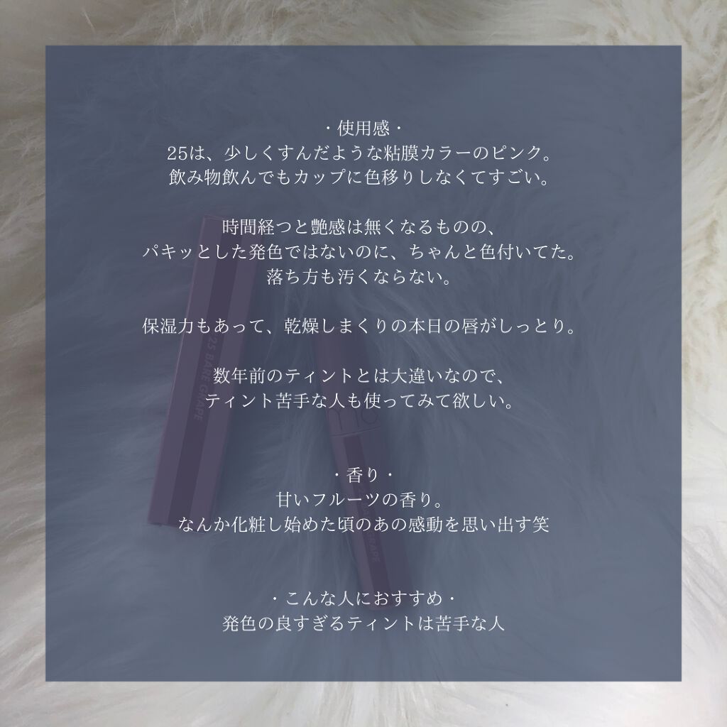 | 口紅・グロス・リップライナーランキング第84位 | 潤いが長続きします! 透け色ですが、重ねればパキッと仕上がるので調整しやすいティントだと思います!! | 詳細を見る |