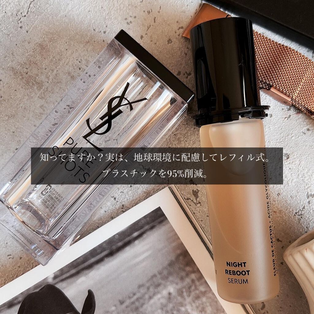 - YSL No.1美容液が進化。 翌朝出会う。8時間熟睡の美肌。 先進技術により、パワフルなボタニカルを約20倍*配合。 深夜24時から始まる、たったの1時間の「肌のピークタイム」に着目し、まるで8時間熟睡したように。 なめらかで透明感のある毛穴レスな肌印象へ。 *ピュアショット ナイトセラムとの比較 ※ 新製品「ピュアショット ナイト リチャージセラム」と旧製品「ピュアショット ナイトセラム」はサイズ規格が異なります。新製品のレフィルは旧製品のケースに入りませんので、ご留意ください。
