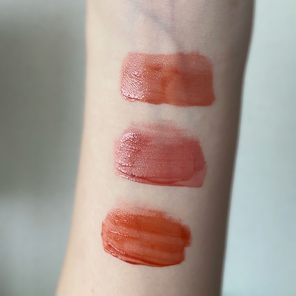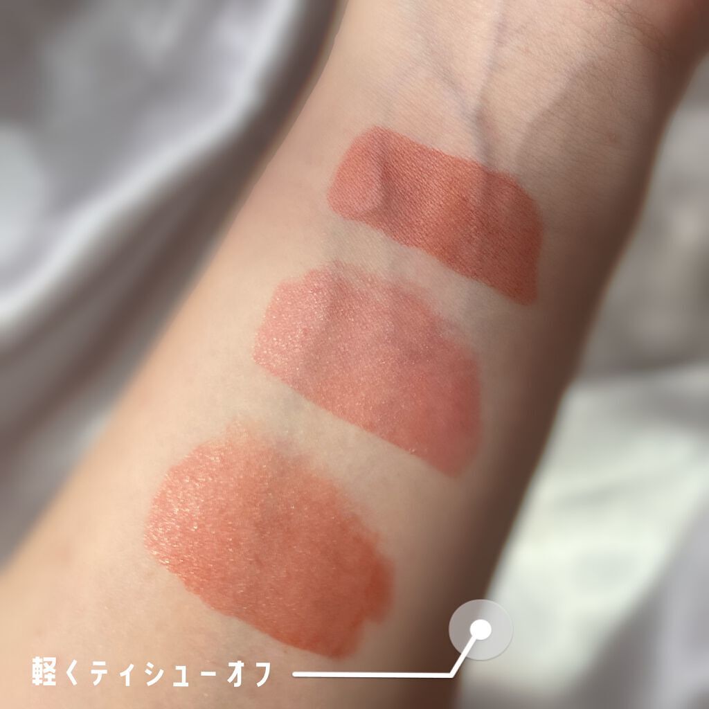 今までみんなご存知のジューシーラスティングティントも愛用してますが 自分的にはかなり高級感がアップした↑ 実物みて感動するぐらいめっちゃ好きなパケ😭🌷 名前通りピーチカラーでイエベさん絶対買って欲しいかわいい色です❤️ イエベさんでも簡単に使えるローズカラーで デートにおすすめなお色です◎ オレンジブラウンカラーで 塗ったら一気にオシャレになれるし秋にぴったりなカラーです🍁 正直。既存のジューシーラスティングティントと似てるような質感ですが くちびるに塗ると新作のほうが若干塗りやすくなった気がします 色持ちは相変わらずめっちゃ良いです◎ 画像の7枚目からはスウォッチ、参考になればと思います。 ティッシュで擦っても色はちゃんと残ってる 既存のティントリップは甘いキャンディな匂いがしたが、 今回の新作は少し匂いもしますが、嫌な甘い匂いではない。 匂い人それぞれ感覚違うですけど、個人的には結構大丈夫だし、むしろ前の商品より好き♡