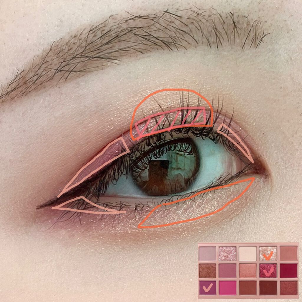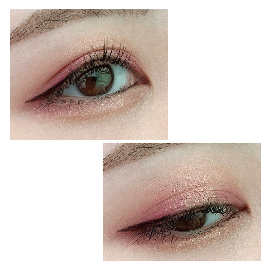 このメイクのポイントは、塗り方にあります✨ 色をがっつり分けて塗るのが、意外と盛れちゃうのです♡ 小豆色を忍ばせて、京都気分を味わいましょ🍁 1.左上の透けツヤ色で目を囲む 2.右上のピンクを二重幅にのせる 範囲は目頭から半分の位置 ❗️ぼかしたりせずそのままの発色で 3.左下くすみピンクを二重幅にのせる 範囲は②で塗らなかった部分 ❗️このときもぼかさない 4.ブラウンをうすーく目のキワにライン状にのせる ②と③のときに色を混ぜないのがポイント💕