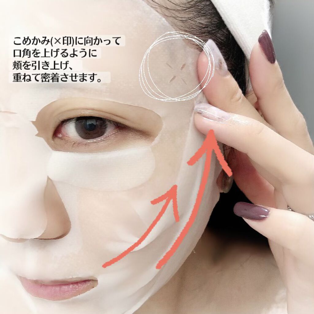 - 口角から頬全体へ引き上げながら密着させ、ホールド。うるおって、ハリとツヤに満ちた肌へ導くシートマスク。頬・口角バンドとフェースラインバンドをこめかみに向かって引き上げて、笑顔の形状へ。密着性が高く、肌の動きに追随する濃密セラムに浸した高密着マスクで、約10分間のお手入れの間中、動き回ってもずれないホールド力を実現。心地よいお手入れタイムで、気分までも引き上げるよう。