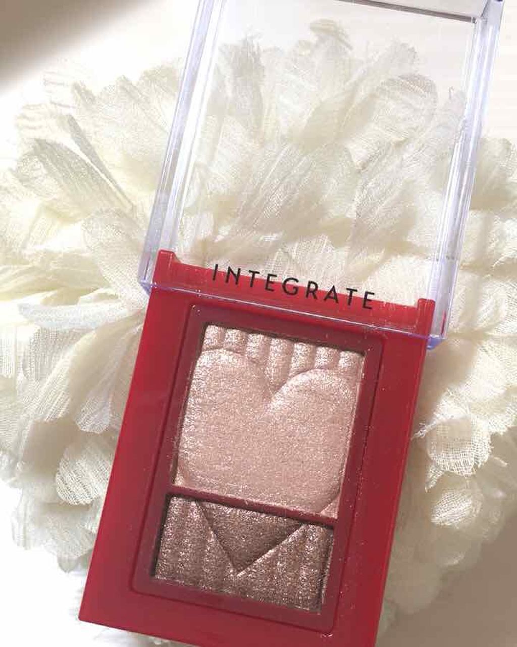 \インテグレートワイドルックアイズ/スライド式の可愛いアイシャドウ♡BR271WT974BE272ベージュとブラウン使いやすいベージュカラーPK373ピンクとバーガンディ女性らしいピンクハートの刻印はかわいすぎ❤️粉とびすごいけどラメが可愛い...
