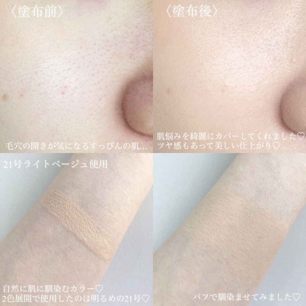さすが高品質だなと思ったのはカバー力があるのに元から綺麗な肌だったようにみせてくれる素肌感のある仕上がりになるところ✨ 重ねても厚塗り感はなく、素肌っぽさがあります🕊 カバー力と素肌感のある仕上がりを同時に叶えてくれるのはとても嬉しいですよね👏 潤いも続くので乾燥しにくく、これからの季節にも良さそうだなと思いました🍂 1日つけているとやはりテカリは出てきましたが、汚く崩れたりはしませんでした! 保湿も持続して1日つけたままでも乾燥はあまり感じませんでした😌 私は明るめの肌色なのでちょうど良かったです✨ 私の肌色よりは少し黄味寄りでしたが、強くはないので違和感なく使用できました🕊 また、良い香りですがほぼ香りがしないくらいで、ファンデ特有の香りや強い香りが苦手な方も使いやすいと思います✨
