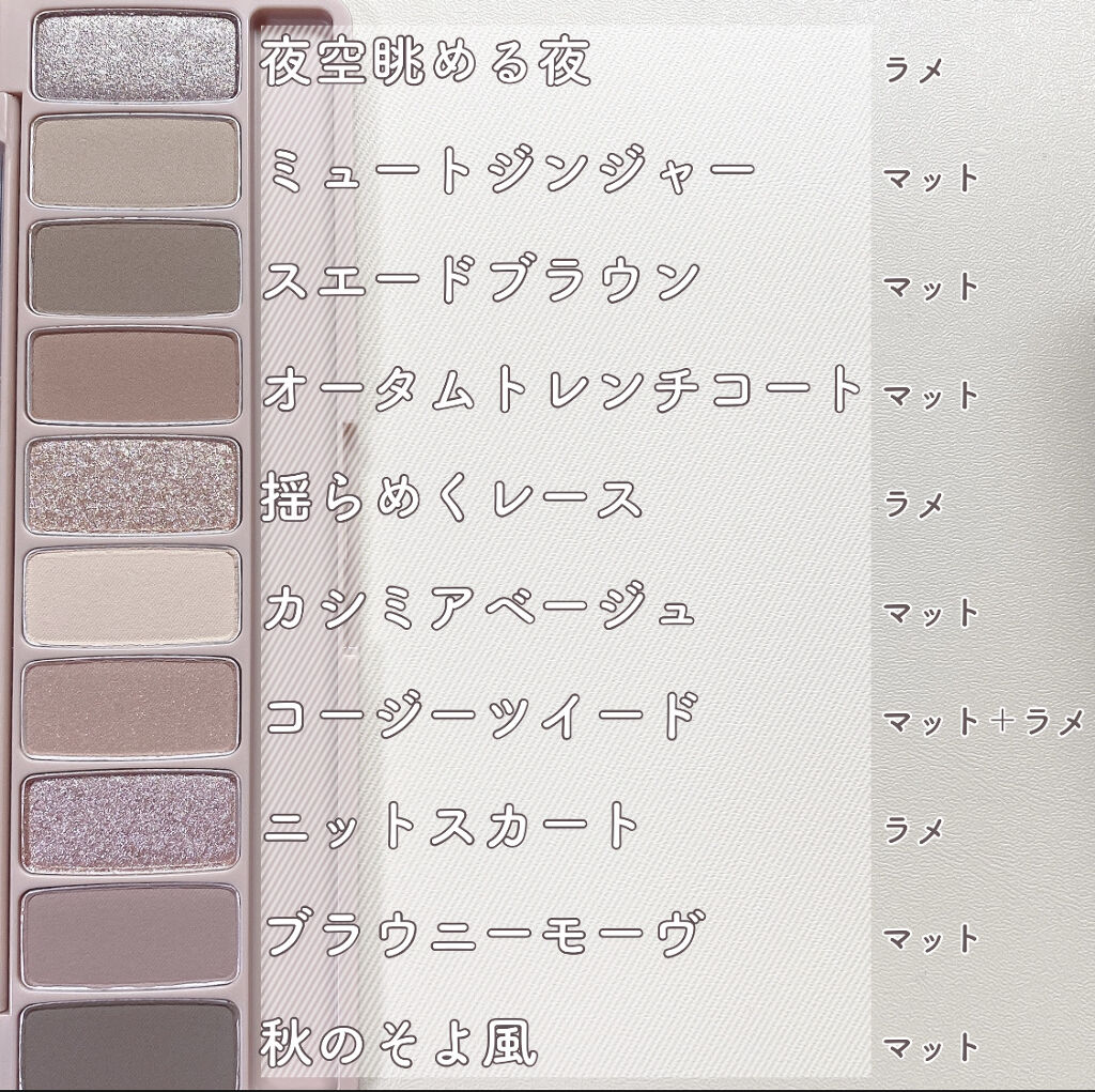 【オータムクローゼット】は、秋のクローゼットからインスパイアされたグレージュカラーのパレットです。 オールマットでパキッとメイクもできるし、ラメを使ってきらめきのあるメイクもできます✨ マットカラーもラメもしっとりとした粉質で高発色!!ぴたっと密着してくれます。 イエベさんにもブルベさんにも使いやすいブラウン~グレージュの垢抜けカラー。 これは秋カラーだけど秋以外も使いまくりたいくらい、ほんとにかわいすぎて、 メイクする時以外もパレットを開いて眺めちゃうくらいキレイなカラーの組み合わせです🥺✨ 私は迷って迷って迷ってやっと購入したのですが、もっと早く買えばよかった… 「やばいかわいい〜!!」ってなること間違いなしです☺️