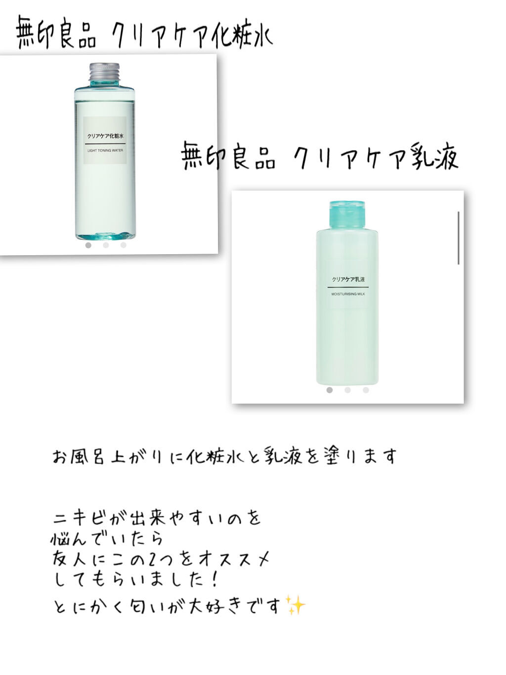 お風呂入った瞬間、私のスキンケアは始まります。 ・ソフティモ ディープクレンジングオイル ・ソフティモ スッキリ あぶらとり 洗顔 ・パーフェクトホイップ アクアケア ・無印良品 クリアケア化粧水 ・無印良品 クリアケア乳液 ・ビューティースター CICAクリーム ・バイオイル そして私は最近化粧水ではなくパックをしています! ・ルルルン ピュア ピンク バランス ・毛穴撫子 お米パック