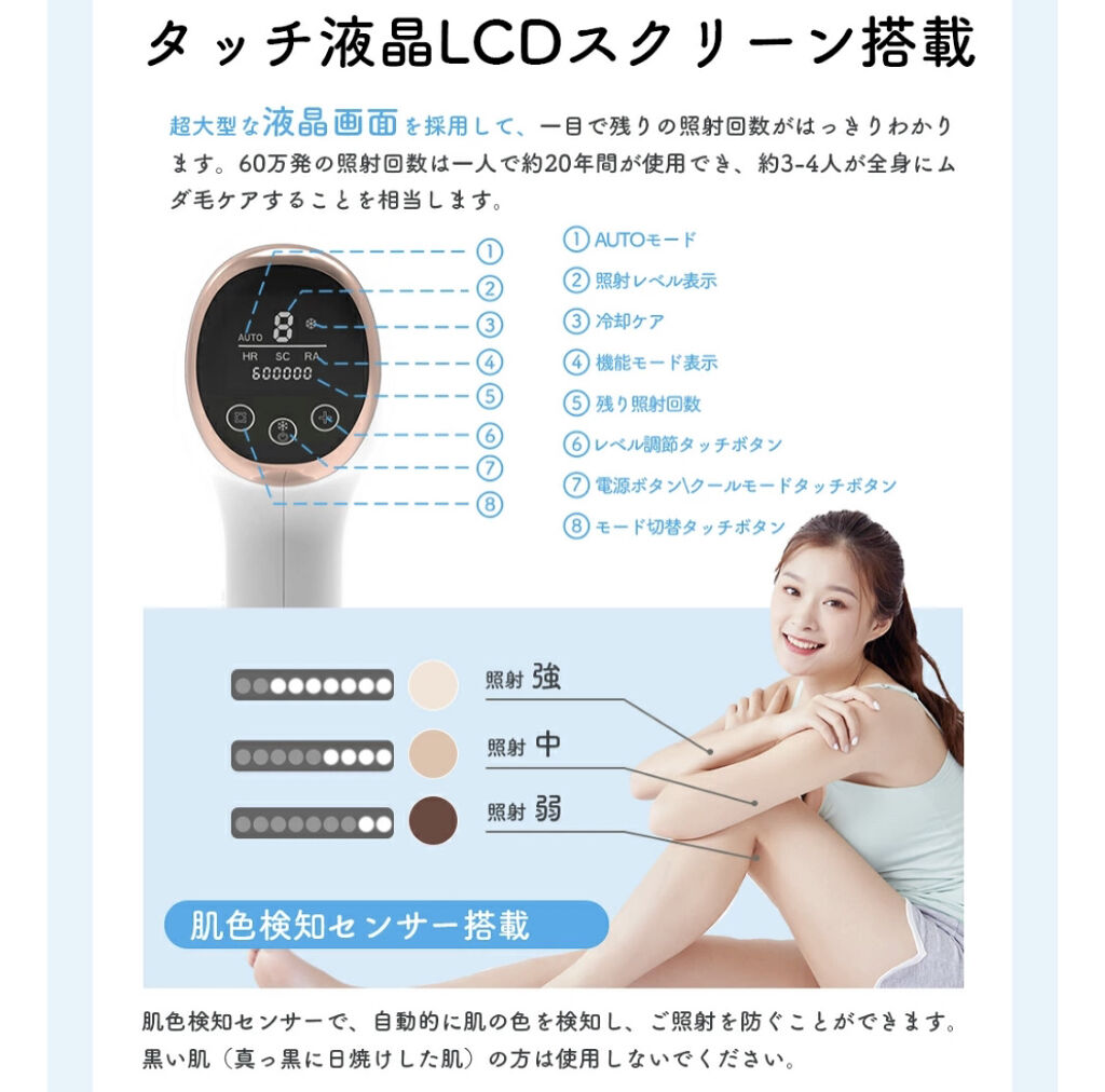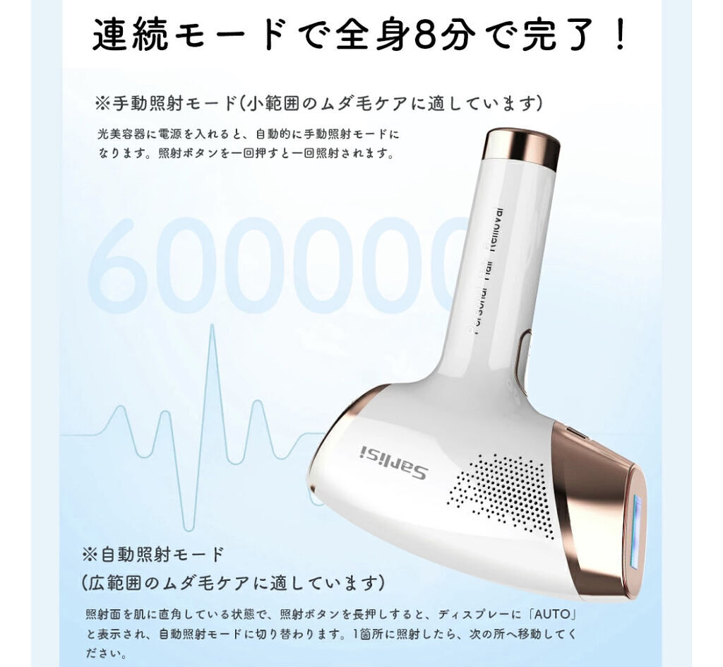 - ※2023年12月21日〜製品リニューアル。リニューアル品はパッケージ・仕様(本体上部に電源ランプが追加)が少々異なりますのでご注意ください。 ●いつでも好きな時に好きな場所でムダ毛ケア出来る!自宅でエステサロンのムダ毛ケア体験を楽しむ! ●新モデル登場:60万発ショット数!ご家族と1台で共用できる。 ●九段階照射レベル:使用部位や肌質によって、照射レベルが1~9調整できるので、ムダ毛ケア効率がアップ! ●三つのモードと切替:HR(ムダ毛ケア用)、 SC(スキンケア用)、RA(美肌モード)。電源ボタンとフラッシュボタンを同時に押すと切替できます。 ●全身対応/男女兼用:目の周りや唇以外に、全身に適用する。 ●個人的の肌質や使用部位によって、ムダ毛ケア効果と美顔効果が異なります。