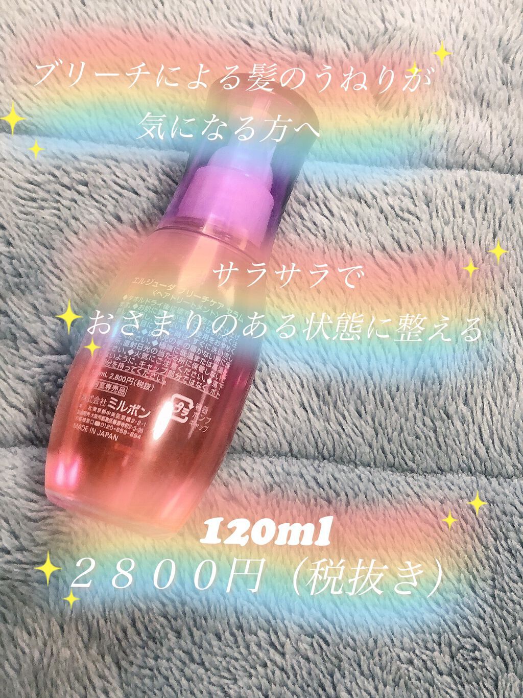 ミルボンエルジューダブリーチケアセラム〈ヘアトリートメント〉120mLブリーチによる髪のうねりが気になる方へサラサラでおさまりのある状態に整える♪こちらは、美容室専売品で人気の「ミルボン」から出ているヘアオイル♪先日、ブリーチをしたので買って...