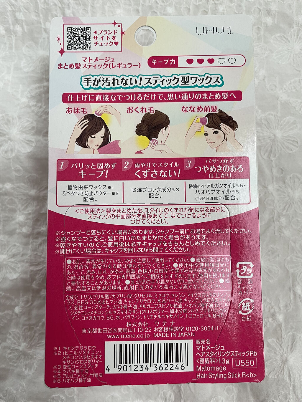 - まとめ髪のおくれ毛やあほ毛をピタッとキープするスティック型ワックス。ナチュラル仕上げのレギュラータイプ。髪に直接なでつけるだけで、バリッと固めずヘアスタイルをキープします。前髪のスタイリングやニュアンスアレンジにも。