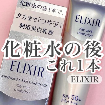 大バズりしていて売り切れ続出だった エリクシールのデーケアレボリューション♩ 乳液、UVカット、化粧下地の役割があって化粧水塗ったあとはこれ1本で済ませられるから時短にもなって嬉しい◎ 塗ってみるとちゃんと馴染んで自然な血色感を出しつつ、パーンっと明るい肌になってくれる🫶✨