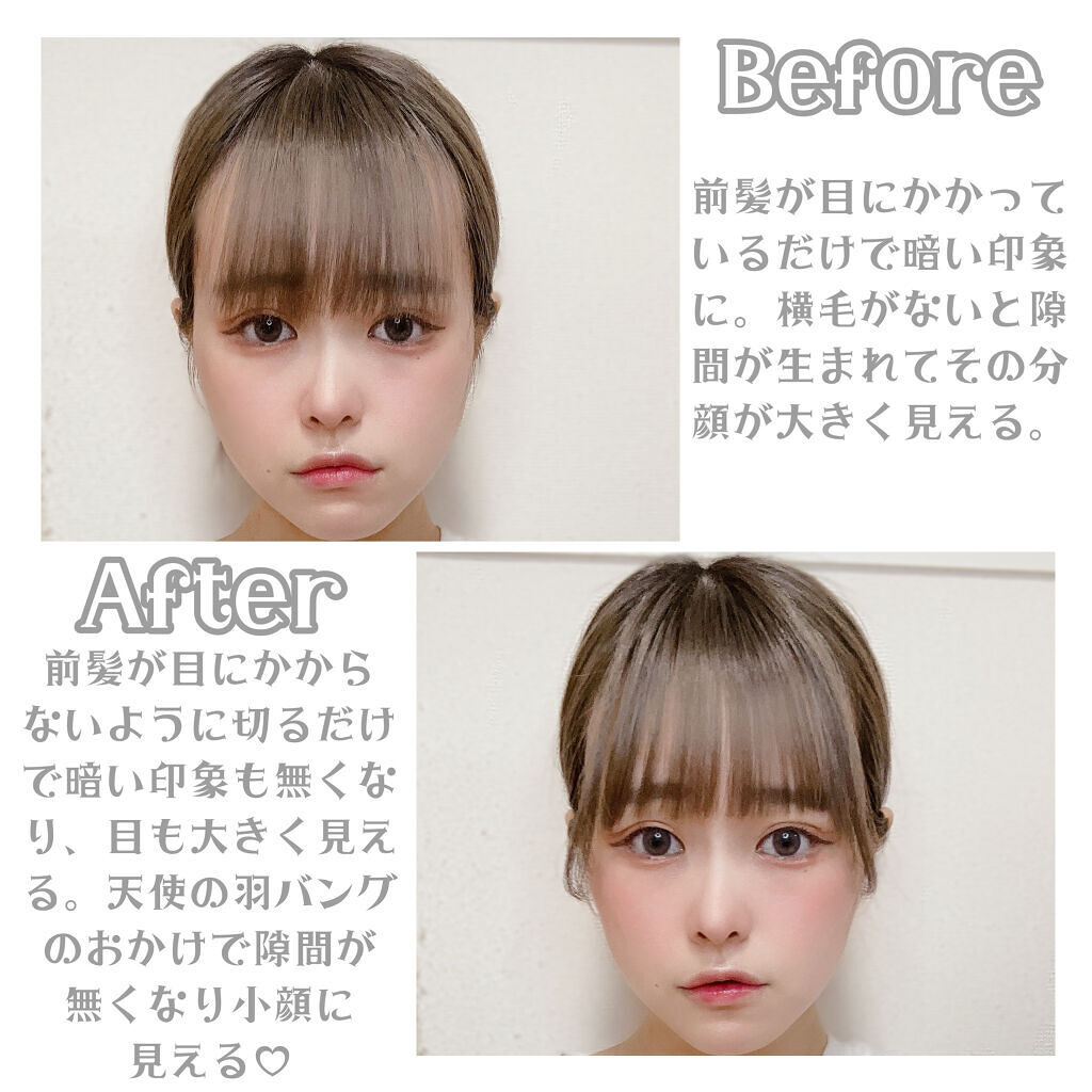じゃあ、さっそく天使のバング(触角)のカット&セットの仕方を説明しよかな? 前髪の生え際から2センチ位まで触角にすると◉ 触角にしたい髪を持って🦰鼻位の高さの所を片手で持つ。 ハサミ✂️を持って唇の真横位で髪の毛を切る。 コテを160〜180°までに設定(私は癖毛なので180°) 触角を外側に巻いていく→毛先は巻かなくてOK🙆♀️ ケープを指に吹きかけて指🤌で巻いた触角に付けてく。