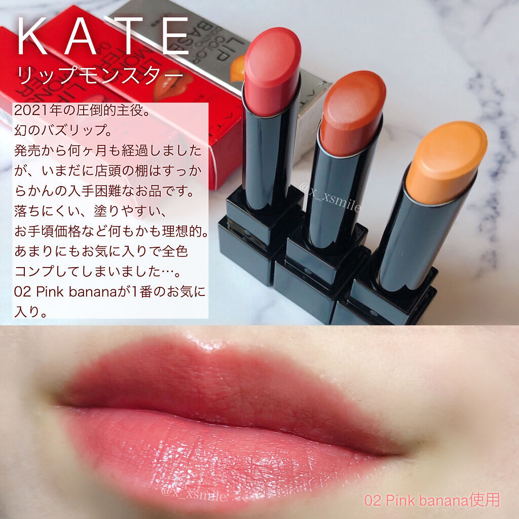 。.。・.。゚+。。.。・.。゚+。。.。・.。゚+。。.。・.。゚+。。.。・.。【KATE】リップモンスター¥1,540(税込) 01欲望の塊 02Pinkbanana 04パンプキンワイン 062:00AMリップカラーコントロールベース...