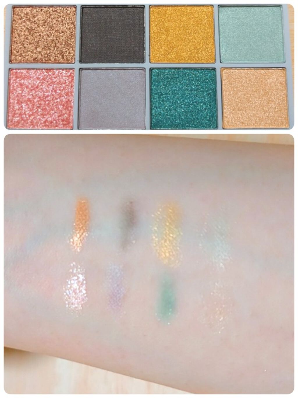 左上…若干ピンクがかった白。ハイライトにしても綺麗。 右上…青み強めのピンク。 左下…コーラルピンクみたいな色。ゴールドのラメ入り。 右下…ワインみたいなボルドー。眉毛にも使えそう。 わりとしっかり発色で「ピンクです!」って感じ。 混ぜてももちろん可愛いけど、単色使いでも可愛い✨