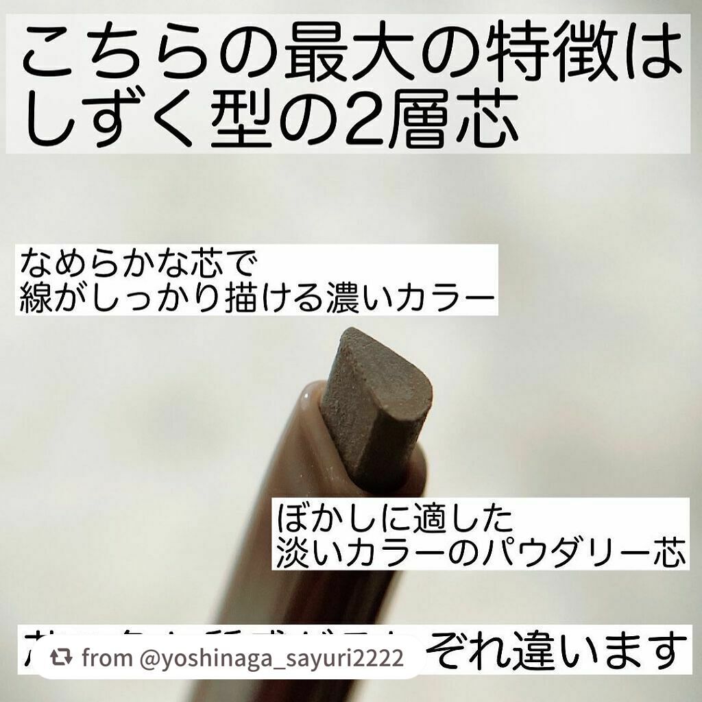 - 描き足しながらぼかせる。 ペンシルとパウダーを一つの芯にまとめた 2層芯アイブロウ ●しずく型2色グラデ芯で、自眉となじむ自然な仕上がり ー角の濃いカラーで、1本1本毛を描き足せるような細いラインを実現 ー面の淡いカラーで、自然にぼかしたような仕上がりを実現 ●毛流れを整え、自然になじませるスクリューブラシつき ●ウォータープルーフ処方 ●汗、皮脂、こすれに強く、美しい仕上がりが長時間持続 ●トリートメント成分配合 ースクワラン ●無香料 ●アレルギーテスト済(すべての方にアレルギーが起きないというわけではありません) <使い方> ●芯を2mm程度繰り出してお使いください。 ●芯の角で眉毛を1本1本描き足し、眉頭や輪郭は芯の面の部分でなじませるようにぼかします。 ●芯の出しすぎや落下などの衝撃により折れることがありますのでご注意ください。 ●ご使用後は、芯をもとにくり戻しキャップをきちんとしめてください。 ●ブラシはいつも清潔にしてお使いください。 ●日のあたるところや高温のところにおかないでください。 ●まれに芯の表面に白い粉のようなものがみられますが、品質上問題はありません。