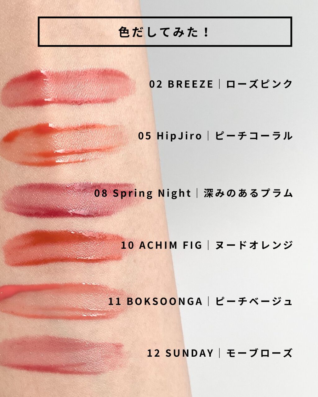 - <01 ラヴィアンコーラル> 精製水、ジフェニルジメチコン、リンゴ酸ジイソステアリル、ビスジグリセリルポリアシルアジペート-2、水添ポリイソブテン、ジグリセリン、セチルPEG/PPG-10/1ダイメチコン、DPG、イソステアリン酸ソルビタン、ポリソルベート60、オクチルドデカノール、ペンチレングリコール、グリセリン、二酸化チタン、セテアレス-20、アクリル酸ヒドロキシエチル/ナトリウムアクリロイルジメチルタウリン酸共重合体フェノキシエタノール、スクアラン、ポリグリセリン-3、香料、ステビオシド、黄色4号、エチルヘキシルグリセリン、赤色227号、トリ(カプリル/カプリン酸)グリセリル、赤色104号(1)、トコフェリルアセテート、黄色5 号、ブリリアントブルーFCF、マンゴー果実エキス、リンゴエキス <06 フィグデュー> 水、ジフェニルジメチコン、リンゴ酸ジイソステアリル、ポリアシルアジピン酸ビス-ジグリセリル-2、水添ポリイソブテン、ジグリセリン、セチルPEG/PPG-10/1ジメチコン、ジプロピレングリコール、イソステアリン酸ソルビタン、ポリソルベート60、オクチルドデカノール、ペンチレングリコール、グリセリン、二酸化チタン(CI) 77891)、セテアレス-20、アクリル酸ヒドロキシエチル/アクリロイルジメチルタウリンナトリウムコポリマー、スクワラン、フェノキシエタノール、ポリグリセリン-3、香料、ステビオシド、赤28(CI 45410)、黄6(CI 15985)、黄5(CI 19140)、エチルヘキシルグリセリン、レッド 33 (CI 17200)、カプリル酸/カプリン酸トリグリセリド、酢酸トコフェロール、ブルー 1 (CI 42090)、Mangifera Indica (マンゴー) 果実エキス、Pyrus Malus (リンゴ) 果実エキス <12 日曜日> 水、ジフェニルジメチコン、リンゴ酸ジイソステアリル、ビスジグリセリルポリアシルアジペート-2、水添ポリイソブテン、ジグリセリン、セチルPEG/PPG-10/1ジメチコン、DPG、イソステアリン酸ソルビタン、ポリソルベート60、オクチルドデカノール、ペンチレングリコール、グリセリン、セテアレス-20、(アクリル酸ヒドロキシエチル/アクリロイルジメチルタウリンNa)コポリマー、フェノキシエタノール、スクワラン、ポリグリセリン-3、ステビオシド、香料、エチルヘキシルグリセリン、トリ(カプリル酸/カプリン酸)グリセリル、酢酸トコフェロール、マンゴー果実エキス、リンゴ果実エキス、酸化チタン、酸化鉄、黄4、赤227、赤104(1)、黄5、青1 <【旧】02 漢江ブリーズ> 水、ジフェニルジメチコン、リンゴ酸ジイソステアリル、ポリアシルアジピン酸ビス-ジグリセリル-2、水添ポリイソブテン、ジグリセリン、セチルPEG/PPG-10/1ジメチコン、ジプロピレングリコール、イソステアリン酸ソルビタン、ポリソルベート60、オクチルドデカノール、ペンチレングリコール、グリセリン、二酸化チタン(CI) 77891)、セテアレス-20、アクリル酸ヒドロキシエチル/アクリロイルジメチルタウリンナトリウムコポリマー、フェノキシエタノール、スクワラン、イエロー6 (CI 15985)、ポリグリセリン-3、香料、ステビオシド、エチルヘキシルグリセリン、レッド33 (CI 17200)、レッド28 (CI 45410)、トリカプリル/カプリン酸グリセリド、酢酸トコフェロール、ブルー 1 (CI 42090)、Mangifera Indica (マンゴー) 果実エキス、Pyrus Malus (リンゴ) 果実エキス <【旧】05 ヒップジロー> 水、ジフェニルジメチコン、リンゴ酸ジイソステアリル、ポリアシルアジピン酸ビス-ジグリセリル-2、水添ポリイソブテン、ジグリセリン、セチルPEG/PPG-10/1ジメチコン、ジプロピレングリコール、イソステアリン酸ソルビタン、ポリソルベート60、オクチルドデカノール、ペンチレングリコール、グリセリン、二酸化チタン(CI) 77891)、セテアレス-20、アクリル酸ヒドロキシエチル/アクリロイルジメチルタウリンナトリウムコポリマー、スクワラン、フェノキシエタノール、イエロー6 (CI 15985)、ポリグリセリン-3、香料、ステビオシド、エチルヘキシルグリセリン、レッド33 (CI 17200)、カプリル酸/カプリン酸トリグリセリド、酢酸トコフェロール、ブルー 1 (CI 42090)、Mangifera Indica (マンゴー) 果実エキス、Pyrus Malus (リンゴ) 果実エキス <【旧】09 ソウル ソウル> 水、ジフェニルジメチコン、マレートジソステアル、ビスジグリセリルポリシルダイピン-2、水素化ポリイソブテン、ディグリセリン、セチルペグ/PPG-10/1ジメチコン、ジップロピレングリコール、ソルビトン等酸塩、ポリソルベ酸60、オクティロドデドカン、ペンシェルン、ペントリン酸塩、ペントリ酸塩、ペンシュレン 二酸化チタン (CI 77891)、アクリル酸ヒドロキシエチル/アクリロイルジメチルタウリン酸ナトリウムコポリマー、フェノキシエタノール、スクワラン、イエロー6 (CI 15985)、ポリグリセリン-3、香料、ステビオシド、エチルヘキシルグリセリン、レッド33 (CI 17200)、カプリル酸/カプリン酸トリグリセリド、酢酸トコフェロール、ブルー 1 (CI 42090)、Mangifera Indica (マンゴー) 果実エキス、Pyrus Malus (リンゴ) 果実エキス <【旧】10 朝イチジク> 水、ジフェニルジメ