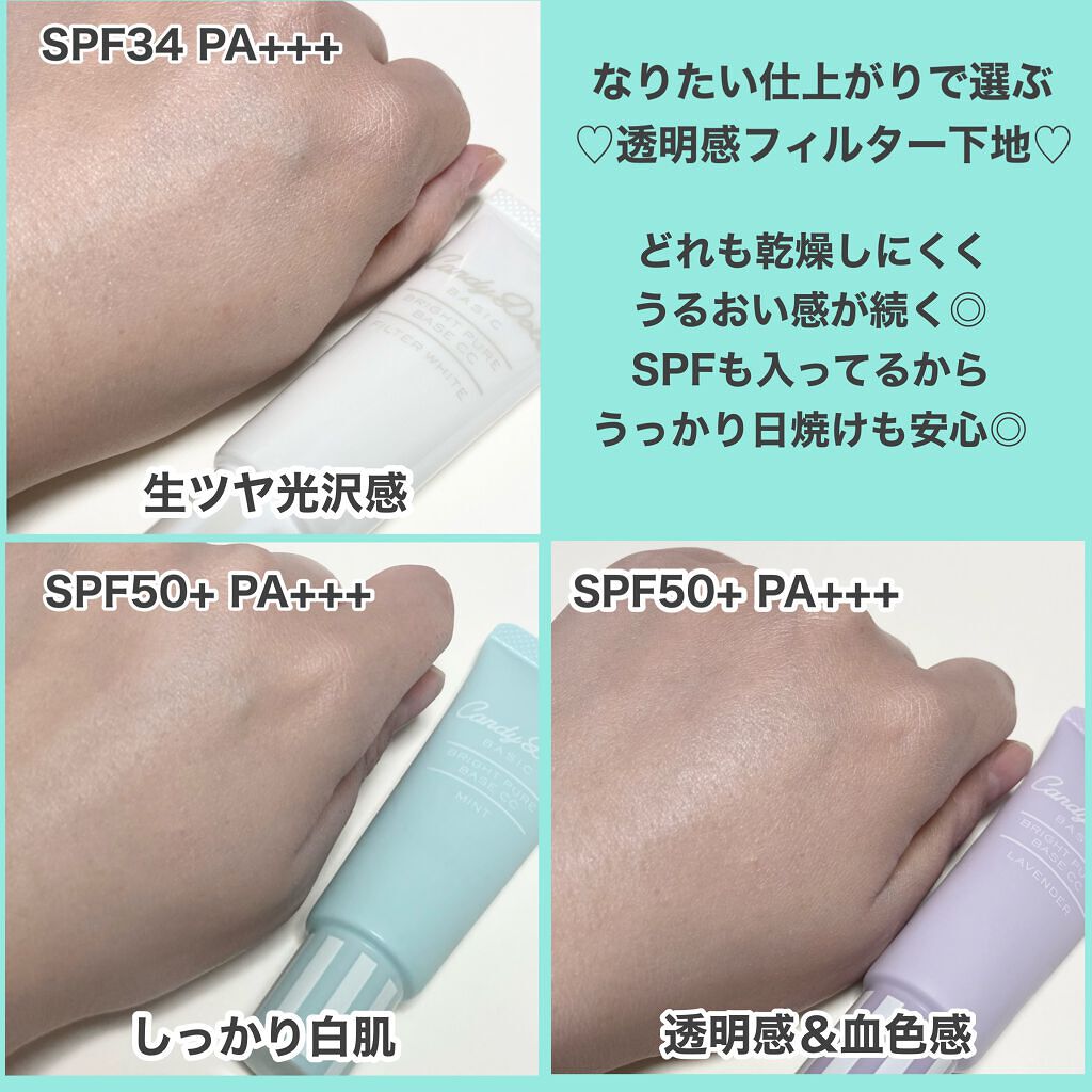 - 大人気商品のブライトピュアベースが透明感にこだわってリニューアル♡! ★商品POINT★ ①こだわりのいいとこどりカラー 肌のくすみ、赤み・ニキビ跡など様々な肌の悩みをしっかりカバーして、ただ肌を白くみせるのではなく、透けちゃうような透明感をプラスしながら肌をパンっと明るい印象にトーンアップ*♡ ②高い紫外線カット効果 SPF50+ PA+++だから、肌に透明感をプラスしながらしっかり紫外線を防いで大切なお肌の日焼けを防止。1本で日焼け止め代わりにも♡ ③ お肌に優しい使い心地のうるおいケア処方 毎日使うものだから、お肌のことを考えて、3種のケア成分&CandyDollこだわりの美容成分を追加配合。たっぷりの美容保湿成分でお肌に優しい使い心地で保湿ケア。 お肌の乾燥くすみ・色ムラが気になる方に! *メーキャップ効果による