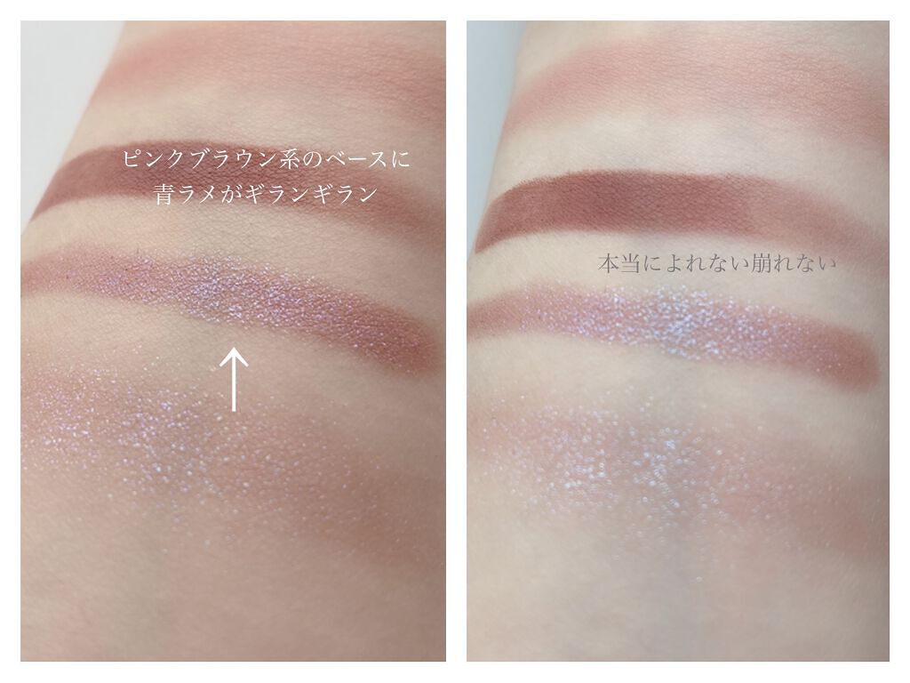 | スルスルなめらかな塗り心地なのに、 目元にピタッと密着!! 指でゴシゴシ擦っても かなーりヨレにくいから、 二重の溝にも溜まりにくいし ラメ飛びしにくい◎ | 詳細を見る | ||