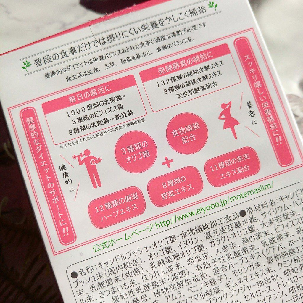 - 1,000億個の乳酸菌と食物繊維、140種類の発酵エキスで、なかから爽快スッキリ美ボディ習慣!! 普段の食事だけでは摂りにくい栄養をかしこく補給し、美容と健康を両立させた美ボディを目指す方におススメのダイエットサポートサプリメントです。 ※1,000億個の乳酸菌は1日分を8粒として製造時の乳酸菌8種類の総量です。
