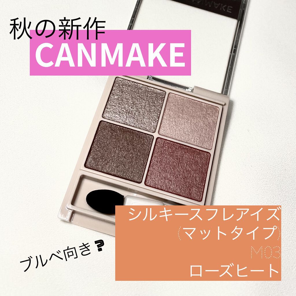 本日のアイシャドウ♡#キャンメイク#シルキースフレアイズマットタイプM03ローズヒートくすみ感のあるカラーで、ダーク系だけど、くすみすぎなく可愛さもありながら、カッコよく決まる✨目力をしっかり出したい方にオススメなカラー!!ラメがトーンアップ...