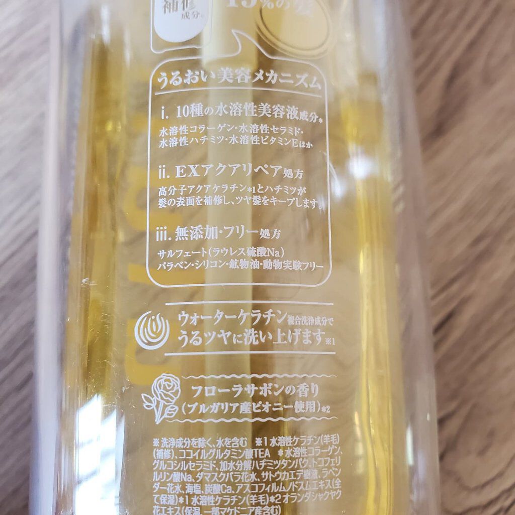 - <シャンプー 340ml> 水、ラウロイルメチルアラニンNa、コカミドメチルMEA、ラウラミドプロピルベタイン、コカミドプロピルベタイン、ココイルメチルタウリンNa、ココイルグルタミン酸TEA、オレフィン(C14-16)スルホン酸Na、水溶性ケラチン(羊毛)、加水分解ケラチン(羊毛)、加水分解ハチミツタンパク、ハチミツ、水溶性コラーゲン、ダマスクバラ花水、グルコシルセラミド、ラベンダー花水、オランダシャクヤク花エキス、アルガニアスピノサ核油、サトウカエデ樹液、トコフェリルリン酸Na、ラウラミドプロピルヒドロキシスルタイン、キシリチルグルコシド、グリセリン、α-グルカン、アスコフィルムノドスムエキス、レシチン、水溶性プロテオグリカン、ソルビトール、ソルビン酸K、炭酸Ca、ジエチルアミノヒドロキシベンゾイル安息香酸ヘキシル、ミリスチルベタイン、ポリクオタニウム-10、クエン酸、安息香酸Na、EDTA-2Na、フェノキシエタノール、BG、エタノール、PPG-7、水酸化K、塩化Na、メトキシケイヒ酸エチルヘキシル、無水キシリトール、PEG-32、キシリトール、PEG-6、メントール、海塩、香料、黄4、黄5 <トリートメント 335g> 水、セテアリルアルコール、ジメチコン、グリセリン、ベヘントリモニウムクロリド、ソルビトール、パルミチン酸エチルヘキシル、加水分解ハチミツタンパク、ハチミツ、水溶性ケラチン(羊毛)、水溶性コラーゲン、グルコシルセラミド、ダマスクバラ花水、加水分解ハトムギ種子、水溶性プロテオグリカン、フリージアアルバ花エキス、ラベンダー花水、アスコフィルムノドスムエキス、サトウカエデ樹液、トコフェリルリン酸Na、α-グルカン、レシチン、ヒドロキシエチルセルロース、ペンテト酸5Na、温泉水、アミノプロピルジメチコン、エタノール、BG、黄4、PG、ソルビン酸K、アモジメチコン、赤227、安息香酸Na、海塩、クエン酸、クエン酸Na、フェノキシエタノール、香料 <詰替え用シャンプー 280ml> 水、ラウロイルメチルアラニンNa、コカミドメチルMEA、ラウラミドプロピルベタイン、コカミドプロピルベタイン、ココイルメチルタウリンNa、ココイルグルタミン酸TEA、オレフィン(C14-16)スルホン酸Na、水溶性ケラチン(羊毛)、加水分解ケラチン(羊毛)、加水分解ハチミツタンパク、ハチミツ、水溶性コラーゲン、ダマスクバラ花水、グルコシルセラミド、ラベンダー花水、オランダシャクヤク花エキス、アルガニアスピノサ核油、サトウカエデ樹液、トコフェリルリン酸Na、ラウラミドプロピルヒドロキシスルタイン、キシリチルグルコシド、グリセリン、α-グルカン、アスコフィルムノドスムエキス、レシチン、水溶性プロテオグリカン、ソルビトール、ソルビン酸K、炭酸Ca、ジエチルアミノヒドロキシベンゾイル安息香酸ヘキシル、ミリスチルベタイン、ポリクオタニウム-10、クエン酸、安息香酸Na、EDTA-2Na、フェノキシエタノール、BG、エタノール、PPG-7、水酸化K、塩化Na、メトキシケイヒ酸エチルヘキシル、無水キシリトール、PEG-32、キシリトール、PEG-6、メントール、海塩、香料、黄4、黄5 <詰替え用トリートメント 280g> 水、セテアリルアルコール、ジメチコン、グリセリン、ベヘントリモニウムクロリド、ソルビトール、パルミチン酸エチルヘキシル、加水分解ハチミツタンパク、ハチミツ、水溶性ケラチン(羊毛)、水溶性コラーゲン、グルコシルセラミド、ダマスクバラ花水、加水分解ハトムギ種子、水溶性プロテオグリカン、フリージアアルバ花エキス、ラベンダー花水、アスコフィルムノドスムエキス、サトウカエデ樹液、トコフェリルリン酸Na、α-グルカン、レシチン、ヒドロキシエチルセルロース、ペンテト酸5Na、温泉水、アミノプロピルジメチコン、エタノール、BG、黄4、PG、ソルビン酸K、アモジメチコン、赤227、安息香酸Na、海塩、クエン酸、クエン酸Na、フェノキシエタノール、香料