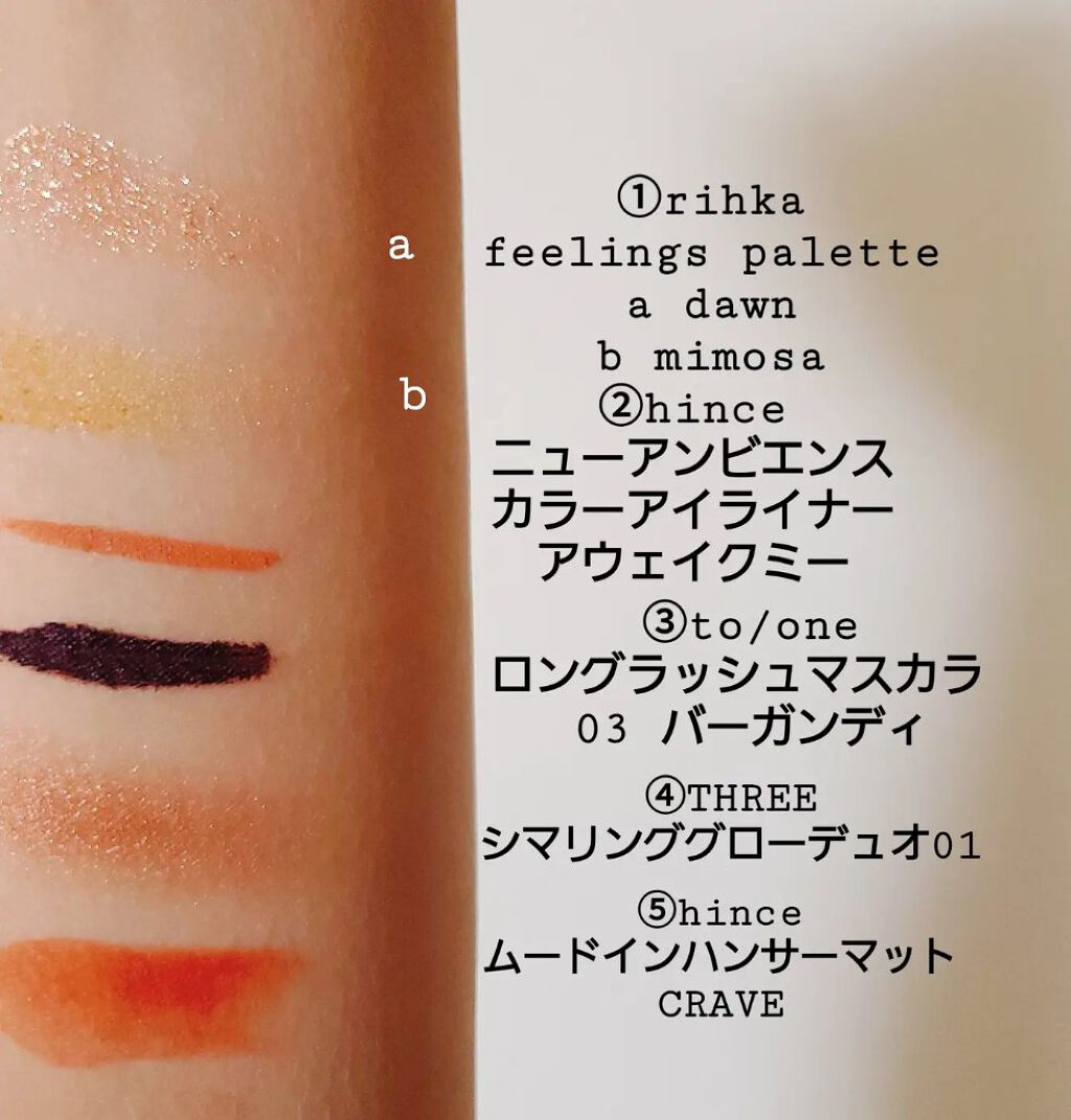 アイブロウは #WHOMEE の#レディモーヴ を使用! #hince の #ニューデップスアイシャドウパレット の a Lowkeyを上瞼全体に馴染ませる。 #rmk の#ザナウナウアイズ 02の #シークレットダスト を目頭に✨ #ヒンス の #ニューアンビエンスカラーマスカラ 上睫毛にブルーの#アンディファインド 下睫毛にオレンジ系の#ライブリー を。 #celvoke の #エンスロールマットリップス 03の テラコッタを💄💋