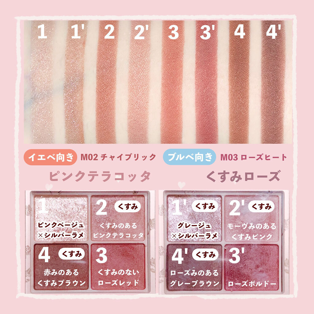 - シルキースフレアイズの姉妹品♡ 肌に溶け込むような透けマットシャドウ 透け感のある柔らかい仕上がりになるマット3色と、透け発色の繊細ラメ1色のパレットシャドウ♡ 完全マットアイや、ラメ×マットアイなど、メイクのパターンを楽しみましょう!