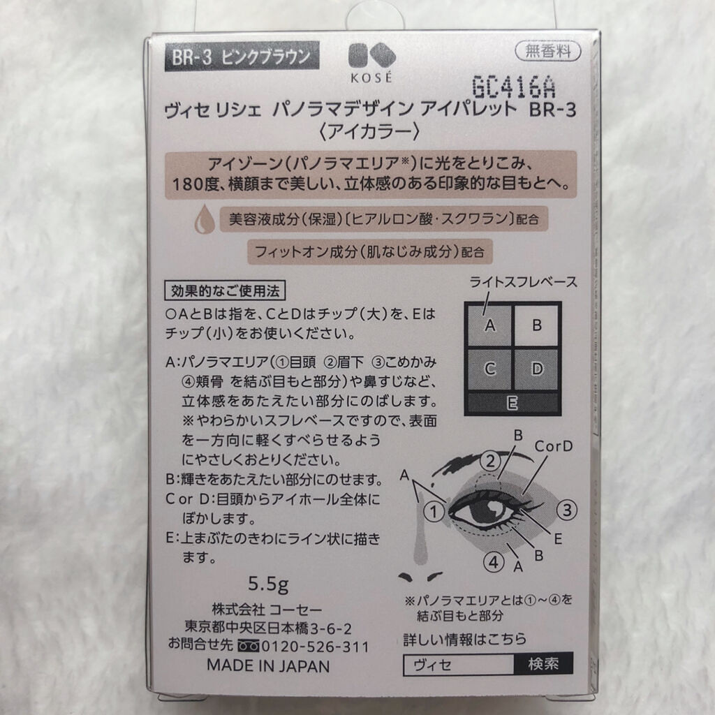 - パノラマエリア※に光をとりこみ、180 度横顔まで美しい、立体感のある印象的な目もとへ。 ● 4つの質感でパノラマエリア※に光をとりこみ、立体的な目もとを叶える5色セットのアイパレットです。※パノラマエリアとは目頭、眉下、こめかみ、頬骨を結ぶ目もと部分 【A色】しっとりとした質感で、光をとりこみ立体感をあたえるライトスフレベース。するするとした軽いのび広がりと、肌への密着性を両立したベースカラーです。あとから重ねるアイカラーの化粧持ちを高めます。 【B色】輝度が高い大粒パールを配合。大胆なツヤや輝きをあたえたい部分に重ねて、華やかな印象に仕上げます。 【C色】なめらかなのび広がりで発色が高く、上品で繊細な輝きをあたえるアクセントカラーです。 【D&E色】やわらかな質感。マットでフォギーな仕上がりで、ふんわりとした印象を叶えます。 ● 肌との親和性の高いフィットオン成分配合。肌なじみの良さを叶えます。 ● 美容液成分配合。メイクしながらうるおいを保ちます。 ● 無香料 ※美容液成分〔ヒアルロン酸・スクワラン〕(保湿) ※フィットオン成分(肌なじみ成分)…ラウロイルグルタミン酸ジ(フィトステリル/オクチルドデシル)です。