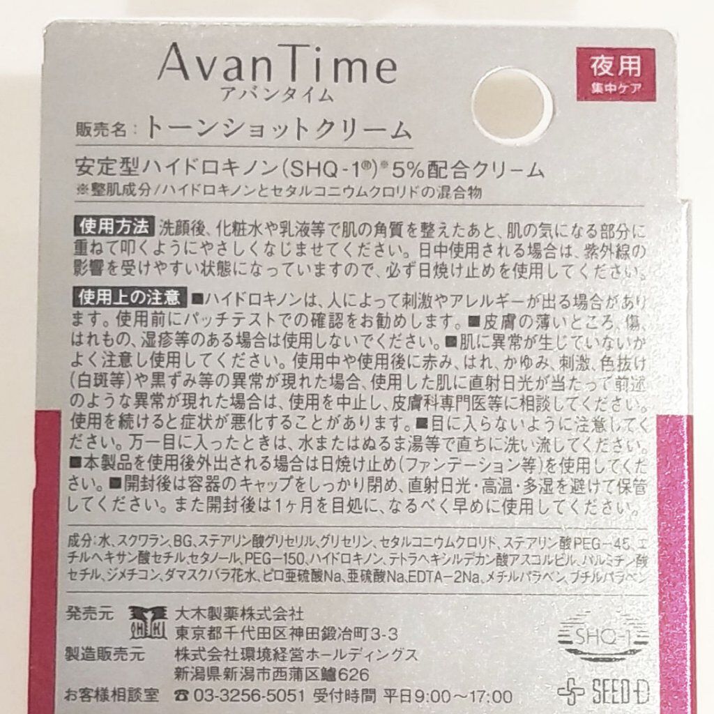 - 「アバンタイム トーンショットクリーム」は安定型ハイドロキノン SHQ-1を5%配合したクリームです。成分が徐々に溶け出しターゲットエリアにアプローチする製品設計であるため、肌にやさしく持続的な作用が期待できます。滑らかで密着しやすいクリームタイプなので、気になる部分を集中的にピンポイントケアすることが可能です。夜のスキンケアの最後に、お肌の気になるポイントにご使用ください。