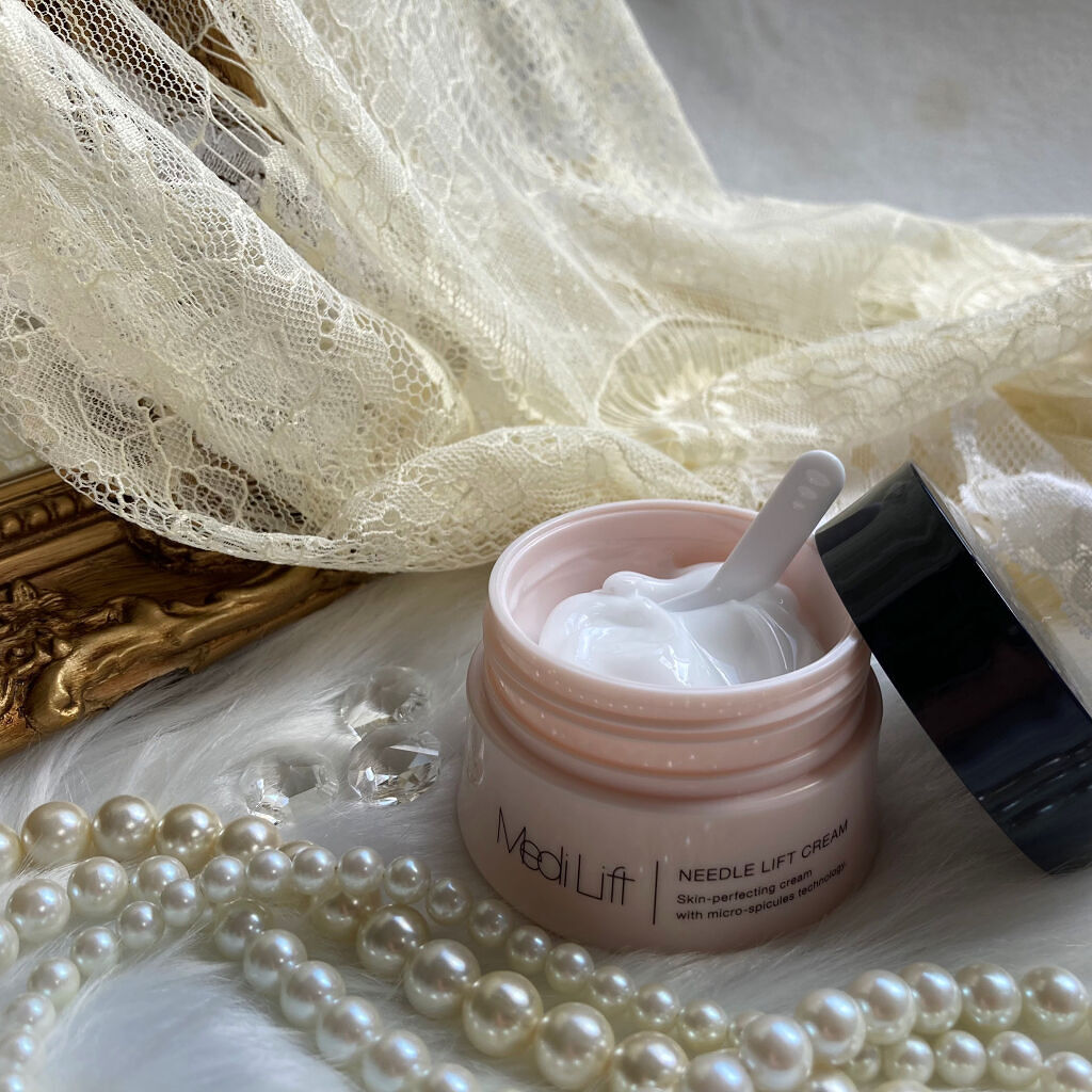 ニードルケアというと、シートマスクのイメージが強くて、目元等の気になる部位に使用するイメージがあったのですが、今はセラムやローション、クリームでお顔全体をケアする時代なのですね。 メディリフト ニードルリフトピールセラムは、目立つ毛穴やごわつき肌は、マイクロニードルで刺して浸透。なんと、純金24Kを纏った天然由来のマイクロニードルを約60万本も配合しているとのこと。 メディリフト ニードルリフトローションは、手に取ったジェルジェル状なのに、すぐにトロトロに変化します。こちらは約180万本のニードルが入っていて肌を補い、満たし、留めるという保水サイクルを作り、お肌にうるおいを与える化粧水とのこと。