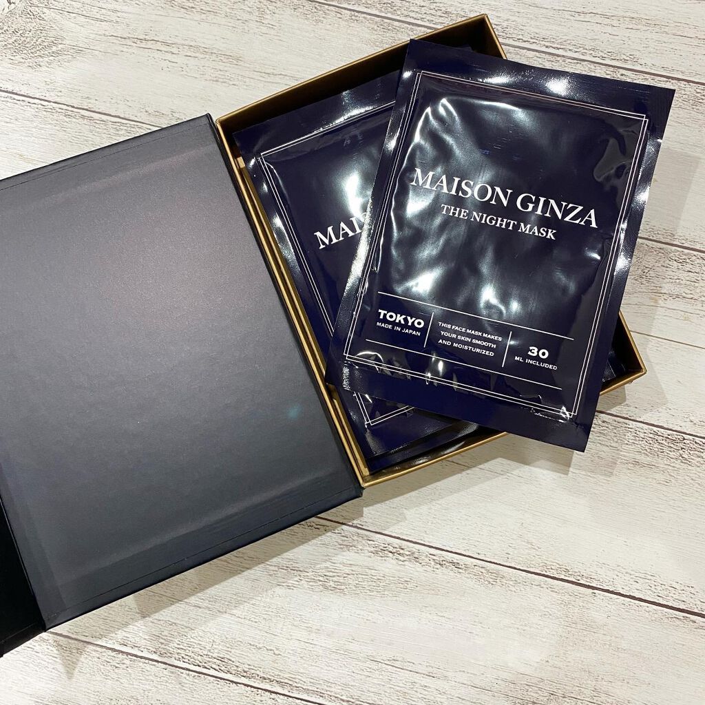 【メゾンギンザザナイトマスク(MAISONGINZATHENIGHTMASK)】5枚株式会社メゾンギンザさんのこちらのマスクお試しさせて頂いてます。銀座発のフェイスマスクとあり、高級感のある化粧箱に入っていて素敵です。マスクは厚めでしっかりし...