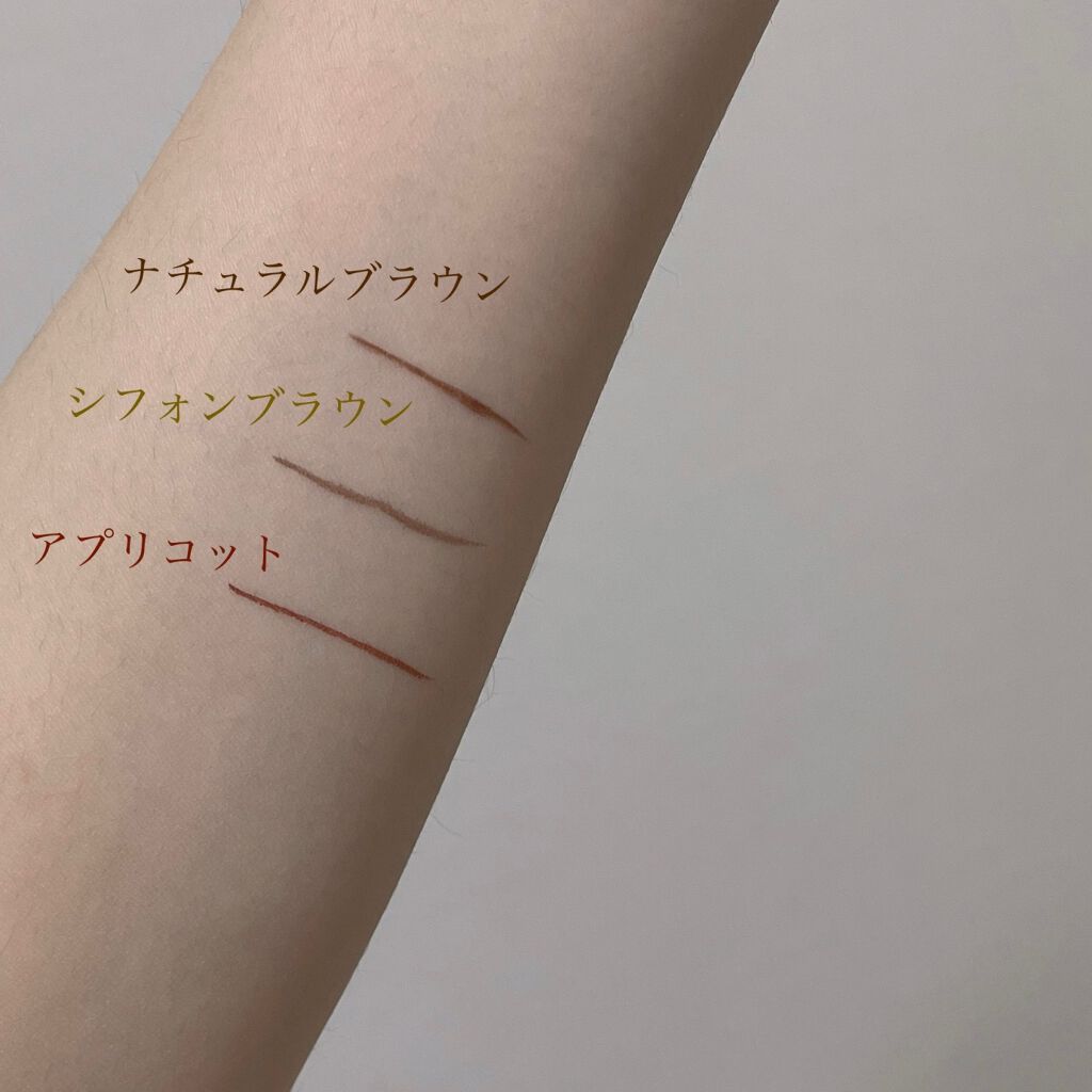 - 筆先までずっとなめらか、目尻で感動するリキッドアイライナー。 必要な量が肌にのる新設計で、まぶたの上をすべるような、滑らかな描き心地。しなやかでコシのある筆が、筆圧のコントロールを容易にし、太いラインも細いラインも思い通りに仕上げます。水、汗、涙に強いウォータープルーフタイプなのに、通常洗顔で簡単オフ。肌に色素が残らない顔料を使用。5種類の美容液成分を従来品の200%配合し、メイクしながら目元ケアまで。 ●ブラウンブラック ※2020年9月12日 バラエティショップ先行発売 ●漆黒ブラック ※2020年12月頃発売予定 ●ナチュラルブラウン ※2020年12月頃発売予定 ●シフォンブラウン 「毎日メイクに透明感と抜け感」 ブラウンでも、グレーでも、ベージュでもないニュアンスカラー。 自然な印影で素の目元を際立て、頑張りすぎない、ふんわりとした目元に。 ●アプリコットブラウン 「じゅわっと血色感。 肌に馴染むおしゃれカラー」 温かみのあるアプリコットがじゅわっと滲む血色感を目元に演出。 肌馴染みが良いので、カラーライナーに抵抗がある方もブラウンの延長線上で楽しめる、使いやすい色味です。 ”ちょっとオシャレ”な空気感を演出するカラー。 ●ピンクショコラ アイライナー 「ピンクが溶け込む濃厚ブラウン」 肌馴染みが良く、目元にじんわり血色感をプラス。 さりげなく女性らしさが加速するようなカラー。 ●ピスタチオラテ (2022年7月29日(金)発売) 「“目尻”に抜け感アクセント」 肌に馴染むのに映える絶妙なグリーン。 トレンドカラーに“くすみ”と“抜け感”をプラスしたまろやかな発色。 ●マスタードブラウン 「“イエロー”が揺れる、大人の洒落色」 (2022年7月29日(金)発売) まるで太陽のような暖かさを感じる新しいブラウン。 ほんのり感じるイエローでメイクが一気に垢抜ける稀有な色。 ●シフォンピンク(2023年2月10日発売) 「ふんわり柔らか"まろみピンク"」 甘くなりすぎない青みニュアンスで目元の透明感UP。 目元を引き締め、ピンクメイクにありがちな腫れぼったさを解消。 ●ミルクカプチーノ(2023年4月21日発売) まろやかな深みの“優しい締め色” どんなメイクにも合わせやすいカラー。 自然な陰影でさりげなく目幅を拡張します。 ●グレーカシミア(2023年10月1日発売) ブラウンがほんのり溶け込んだ、暖色グレー まろやかな発色で、パーソナルカラーを問わず肌に馴染む 目元の陰影になりすまし、抜け感と目力を欲張りに叶える ●ダークフィグ(2024年6月1日発売) するする”なめらか。描きやすいのに、落ちにくい。 クッキリ可愛いほの甘ダークブラウン ●ピーチモカ(2024年8月1日発売) ふわっと自然に盛れる“桃色ブラウン” ほんのり血色感で目元にうるみ感を演出 ●スターダストブラウン(2024年12月11日発売) キラッと繊細に輝く''星屑ブラウン'' 透け感のあるダークブラウンの色味とラメの輝きが、目元に艶のある立体感を演出 ●チャコールモカ(2025年4月10日発売) 目元を締める''深みグレージュ'' 黄みや赤みに偏りすぎない絶妙な色設計で、自然に目元を強調