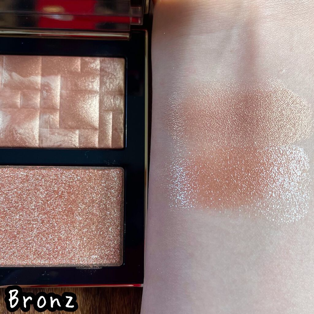 - 2021年10月中発売予定 【限定2種】 ホリディシーズンに華やかなツヤと⾎⾊美を与える、イルミネイターパレットが登場。 肌⾃ら発光するような⾃然で⽴体的なツヤを与える『ハイライティング パウダー』と、微粒⼦パールピグメントを配合し、輝きと⾎⾊をふんわり纏う、軽い付け⼼地の新フォーミュラ『シマリング パウダー』の2フォーミュラをセットイン。 華やかなツヤを与えるピンクと、ヘルシーグロウが叶うソフトブロンズの2種。 単⾊使いで、ハイライターやチークとして、また重ねて使⽤することで、奥⾏きのある⽴体的なメイクが楽しめます。