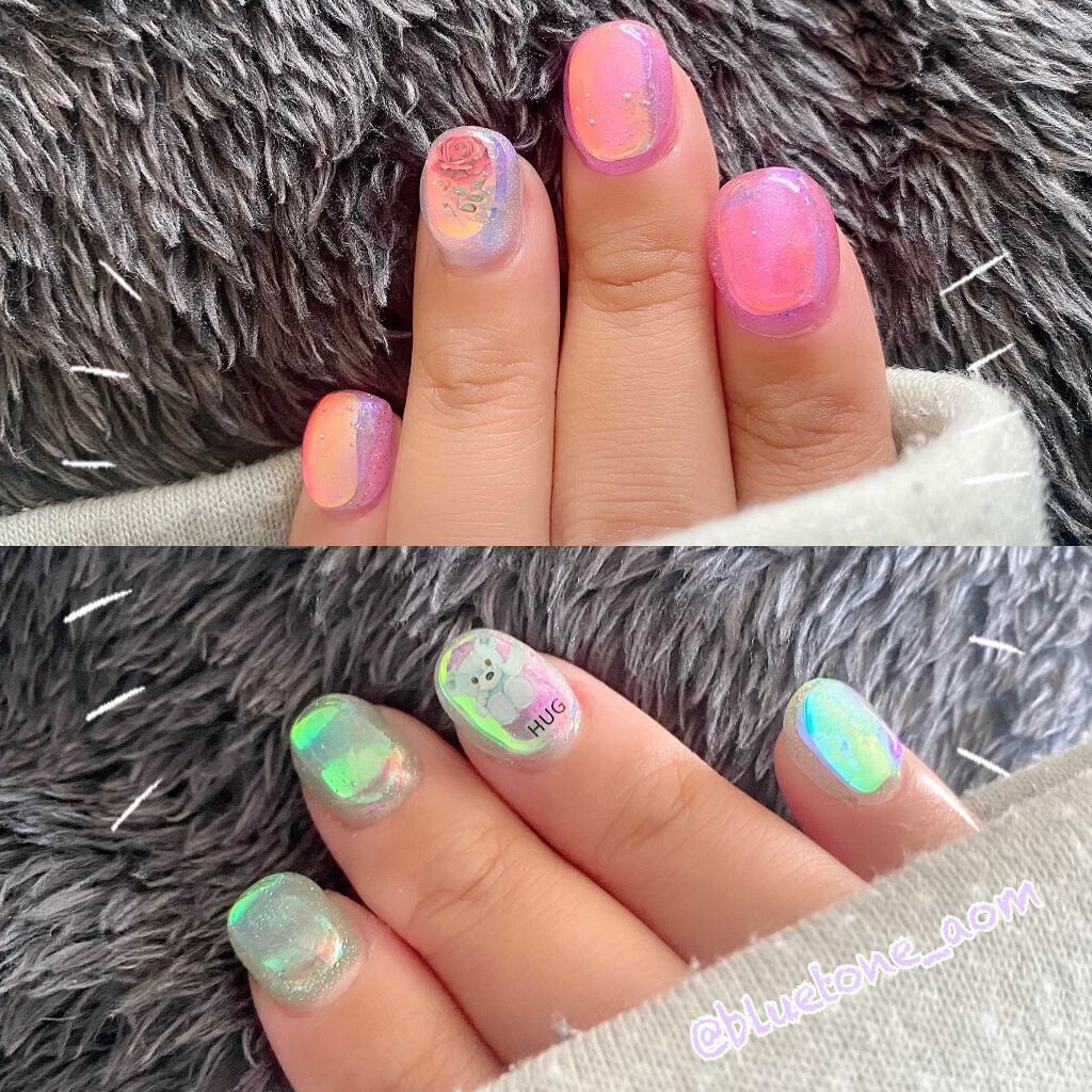 ラメがしっかりしてるし クリアカラーが入ってるから オーロラパウダー無しでも 充分キラキラしました! 反射強めのフィルムなので 実物はもっと うるうるとキラキラが強いです! ビー玉みたい🥺 ネイルシール長持ちさせたいけど ちょっと飽きてきたな〜って時とかに 全然違った印象になるのでオススメです! Seriaのベースジェル 本当にうるうるネイルしやすいので オススメしたい🙆♀️