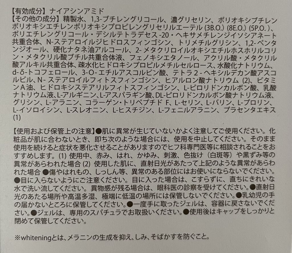 - <有効成分>ナイアシンアミド <その他の成分>精製水、1,3-ブチレングリコール、濃グリセリン、ポリオキシブチレンポリオキシエチレンポリオキシプロピレングリセリルエーテル(3B.O.)(8E.O.)(5P.O.)、ポリエチレングリコール・デシルテトラデセス-20・ヘキサメチレンジイソシアネート共重合体、N-ステアロイルジヒドロスフィンゴシン、トリメチルグリシン、1,2-ペンタンジオール、硬化ナタネ油アルコール、2-メタクリロイルオキシエチルホスホリルコリン・メタクリル酸ブチル共重合体液、フェノキシエタノール、アクリル酸・メタクリル酸アルキル共重合体、疎水化ヒドロキシプロピルメチルセルロース、水酸化ナトリウム、d-δ-トコフェロール、3-O-エチルアスコルビン酸、テトラ2-へキシルデカン酸アスコルビル、N-ステアロイルフィトスフィンゴシン、ヒアルロン酸ナトリウム(2)、ビタミンA油、ヒドロキシステアリルフィトスフィンゴシン、L-ピロリドンカルボン酸、乳酸ナトリウム液、L-アルギニン、L-アスパラギン酸、DL-ピロリドンカルボン酸ナトリウム液、グリシン、L-アラニン、コラーゲン・トリペプチドF、L-セリン、L-バリン、L-プロリン、L-イソロイシン、L-スレオニン、L-ヒスチジン、L-フェニルアラニン、プラセンタエキス(1)