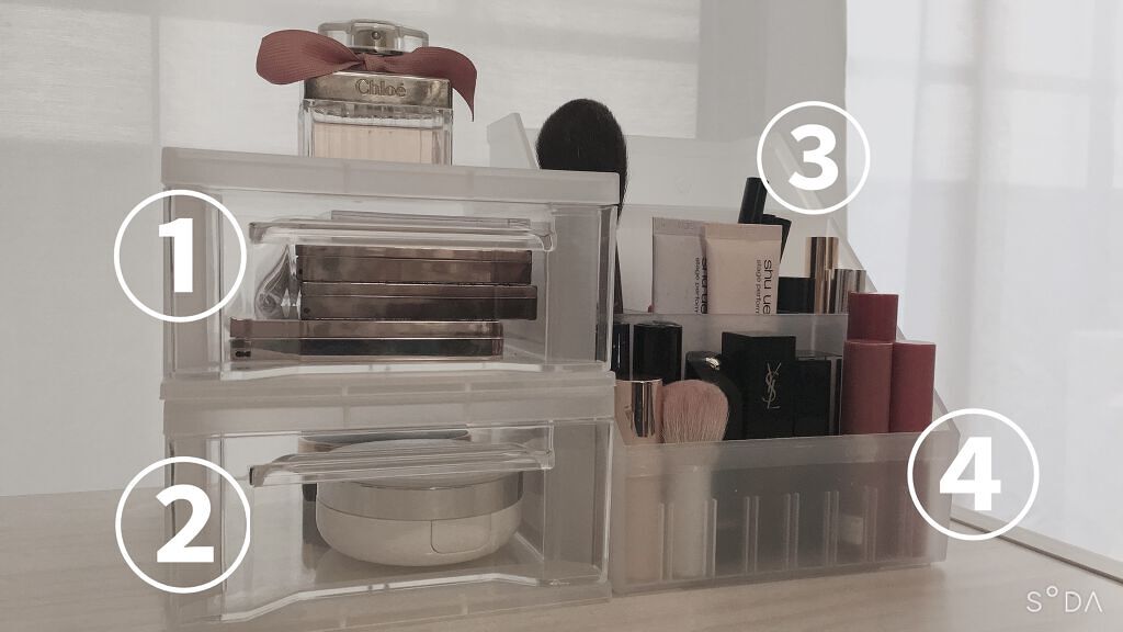 全部100均!総額400円で見せる収納!✼••┈┈••✼••┈┈••✼••┈┈••✼••┈┈••✼①、②は一段ずつバラ売りになってます。重ねられるので、私は2段にしてますが、3段にしたりもできます。③、④は端がフック状になっているので、くっつ...
