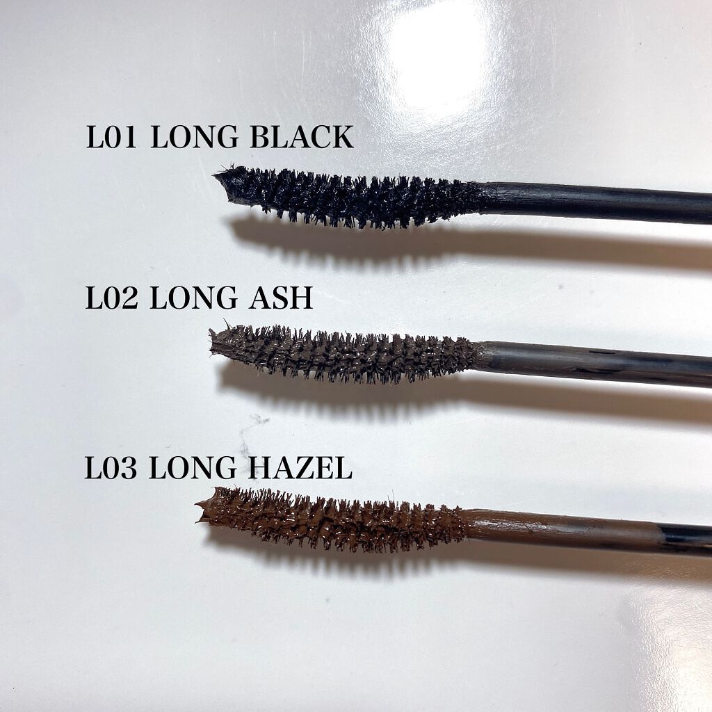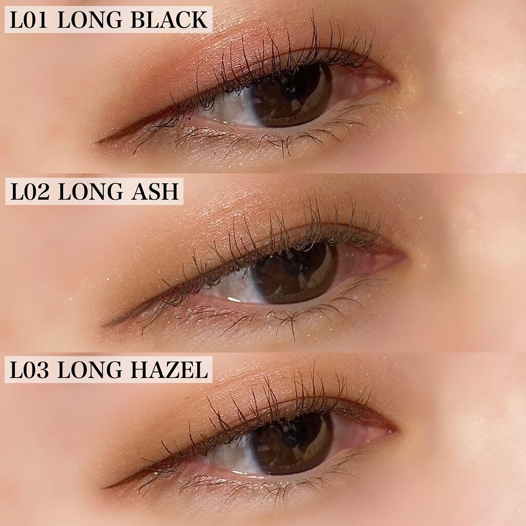 ロングタイプもボリュームタイプも、ブラック・ブラウン共に色味はかわりません。同じ色です😌 ブラックはクリアな発色のブラック。 透明感があるのでナチュラルで、圧迫感がないです☺︎ ブラウンは赤みがおさえられた、まるでミルクチョコレートのようなやわらかいカラー🍫♡ 優しい目元に仕上げてくれます⑅⃝︎ ロングタイプは、ブラシがカーブしてるの! このブラシのカーブは、アジア人の目元に合わせて作られているそうで、とってもぬりやすい! ボリュームタイプは、ストレート型のブラシ。 ナチュラルな束感がでる😌 マスカラの液がロングタイプとボリュームタイプで若干違う気がしました! ロングタイプの方がサラッとしてて、ボリュームタイプの方がもちっとした感じがしたよ😳 ロングタイプ、ボリュームタイプも共通してカールキープ力◎ しっかりカールキープしてくれるけど、まつ毛がカチッとかたまらず、ふんわりやわらかい💗 そしてどちらも、ブラシが細くて目頭とか下まつげとかも塗りやすいし、重ねてもダマになりにくい✨