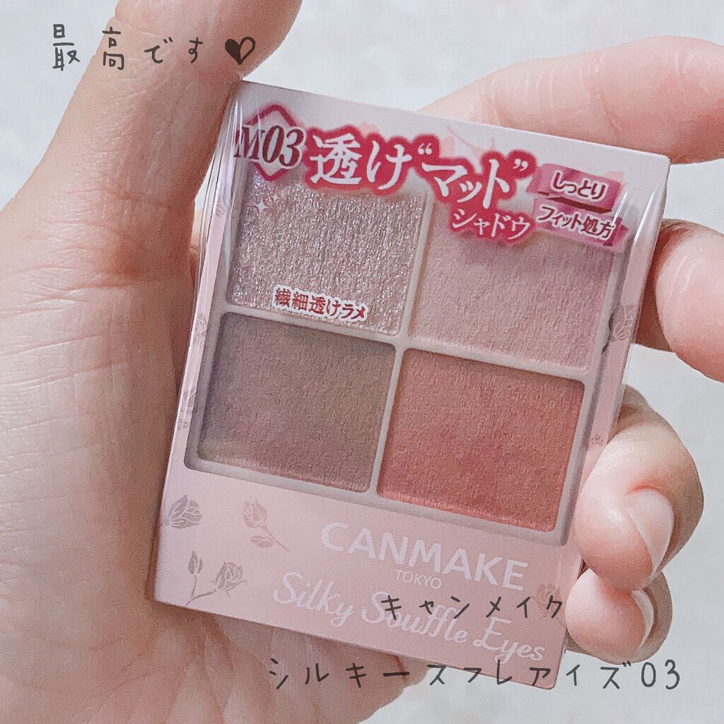キャンメイクシルキースフレアイズマットタイプM04キューピッドペタル¥825◇質感(マット3、小粒ラメ1)質感はマットですがふわっとしていて透け感があるので色を重ねても重くなったり濁ったりしないのが特徴です◎ラメは小粒ですが思った以上にキラッ...