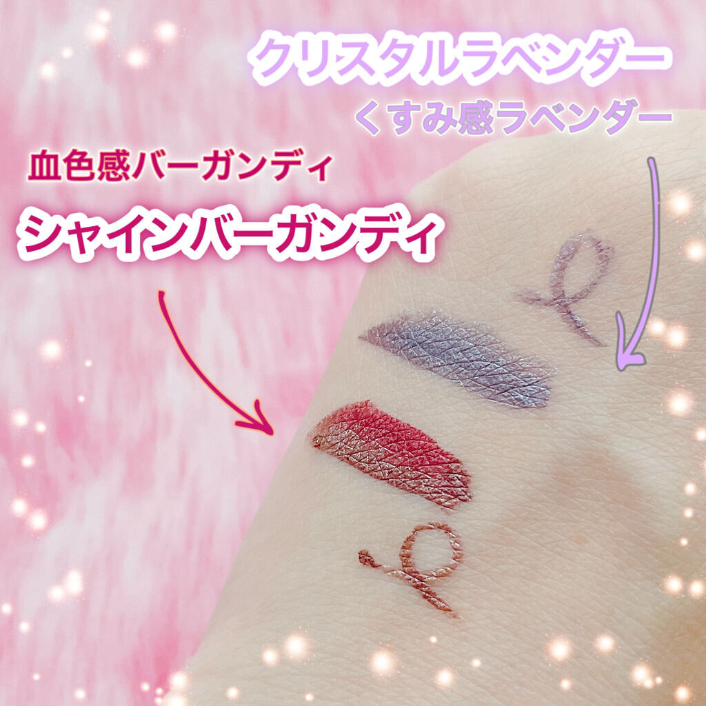 - <04 ラピスブルー> 水、アクリレーツコポリマー、BG、ホウケイ酸(Ca/Al)、1,2-ヘキサンジオール、パンテノール、ポリクオタニウム-51、センブリエキス、カニナバラ果実エキス、ヒアルロン酸Na、サクシノイルアテロコラーゲン、ペンチレングリコール、フェノキシエタノール、DPG、水酸化Na、ポリアスパラギン酸Na、カプリリルグリコール、エチルヘキシルグリセリン、ベントナイト、結晶セルロース、EDTA-2Na、酸化スズ、エタノール、(アクリレーツ/アクリル酸エチルヘキシル)コポリマー、(アクリレーツ/メタクリル酸ジメチルアミノエチル)コポリマー、ラウレス-12硫酸Na、(C11-15)パレス-7、リン酸2Na、リン酸K、ソルビン酸K、メチルパラベン、グンジョウ、マイカ、酸化チタン、酸化鉄、銀 <05 マロングレージュ> 水、(スチレン/アクリレーツ)コポリマーアンモニウム、BG、ホウケイ酸(Ca/Al)、ポリアスパラギン酸Na、1,2-ヘキサンジオール、パンテノール、ポリクオタニウム-51、センブリエキス、カニナバラ果実エキス、ヒアルロン酸Na、サクシノイルアテロコラーゲン、フェノキシエタノール、ペンチレングリコール、ベヘネス-30、ベントナイト、結晶セルロース、カプリリルグリコール、エチルヘキシルグリセリン、アクリレーツコポリマー、EDTA-2Na、水酸化Na、酸化スズ、エタノール、(アクリレーツ/アクリル酸エチルヘキシル)コポリマー、(アクリレーツ/メタクリル酸ジメチルアミノエチル)コポリマー、ラウレス-12硫酸Na、(C11-15)パレス-7、リン酸2Na、リン酸K、ソルビン酸K、メチルパラベン、酸化チタン、酸化鉄、銀、カーボンブラック <06 シェリーピンク> 水、BG、アクリレーツコポリマー、アクリレーツコポリマーアンモニウム、ホウケイ酸(Ca/Al)、1,2-ヘキサンジオール、パンテノール、ポリクオタニウム-51、センブリエキス、カニナバラ果実エキス、ヒアルロン酸Na、サクシノイルアテロコラーゲン、アルミナ、ペンチレングリコール、フェノキシエタノール、ユチャ種子油、グリセリン、DPG、ベントナイト、水酸化K、カプリリルグリコール、エチルヘキシルグリセリン、結晶セルロース、EDTA-2Na、酸化スズ、エタノール、(アクリレーツ/アクリル酸エチルヘキシル)コポリマー、トコフェロール、(アクリレーツ/メタクリル酸ジメチルアミノエチル)コポリマー、ラウレス-12硫酸Na、(C11-15)パレス-7、リン酸2Na、リン酸K、ソルビン酸K、メチルパラベン、酸化鉄、銀 <07 メロウピンク> 水、(スチレン/アクリレーツ)コポリマーアンモニウム、BG、ホウケイ酸(Ca/Al)、1,2-ヘキサンジオール、ポリアスパラギン酸Na、パンテノール、ポリクオタニウム-51、センブリエキス、カニナバラ果実エキス、ヒアルロン酸Na、サクシノイルアテロコラーゲン、炭、ペンチレングリコール、フェノキシエタノール、ベヘネス-25、アクリレーツコポリマー、水酸化Al、ベントナイト、結晶セルロース、グリセリン、カプリリルグリコール、エチルヘキシルグリセリン、ジラウロイルグルタミン酸リシンNa、水酸化K、EDTA-2Na、酸化スズ、エタノール、(アクリレーツ/アクリル酸エチルヘキシル)コポリマー、(アクリレーツ/メタクリル酸ジメチルアミノエチル)コポリマー、ラウレス-12硫酸Na、(C11-15)パレス-7、リン酸2Na、リン酸K、ソルビン酸K、メチルパラベン、酸化チタン、酸化鉄、銀、赤226 <01 クリスタルラベンダー> 水、(スチレン/アクリレーツ)コポリマーアンモニウム、BG、アクリレーツコポリマー、1,2-ヘキサンジオール、パンテノール、センブリエキス、カニナバラ果実エキス、ヒアルロン酸Na、サクシノイルアテロコラーゲン、ペンチレングリコール、フェノキシエタノール、ベントナイト、ポリアスパラギン酸Na、水酸化Na、結晶セルロース、カプリリルグリコール、エチルヘキシルグリセリン、EDTA-2Na、エタノール、(アクリレーツ/アクリル酸エチルヘキシル)コポリマー、(アクリレーツ/メタクリル酸ジメチルアミノエチル)コポリマー、ポリクオタニウム-51、ラウレス-12硫酸Na、(C11-15)パレス-7、リン酸2Na、リン酸K、ソルビン酸K、メチルパラベン、グンジョウ、Al、酸化鉄 <02 シャインバーガンディ> 水、(アクリル酸エチルヘキシル/メタクリル酸メチル)コポリマー、BG、(アクリレーツ/メチルスチレン/スチレン)コポリマーアンモニウム、パンテノール、センブリエキス、カニナバラ果実エキス、ヒアルロン酸Na、サクシノイルアテロコラーゲン、ポリアスパラギン酸Na、フェノキシエタノール、アクリレーツコポリマー、1,2-ヘキサンジオール、ペンチレングリコール、メチルパラベン、水酸化Na、プロピルパラベン、EDTA-2Na、カプリリルグリコール、エチルヘキシルグリセリン、エタノール、(アクリレーツ/アクリル酸エチルヘキシル)コポリマー、(アクリレーツ/メタクリル酸ジメチルアミノエチル)コポリマー、ポリクオタニウム-51、ラウレス-12硫酸Na、(C11-15)パレス-7、リン酸2Na、リン酸K、ソルビン酸K、酸化鉄、カーボンブラック <03 ルミナスブラウン> 水、(スチレン/