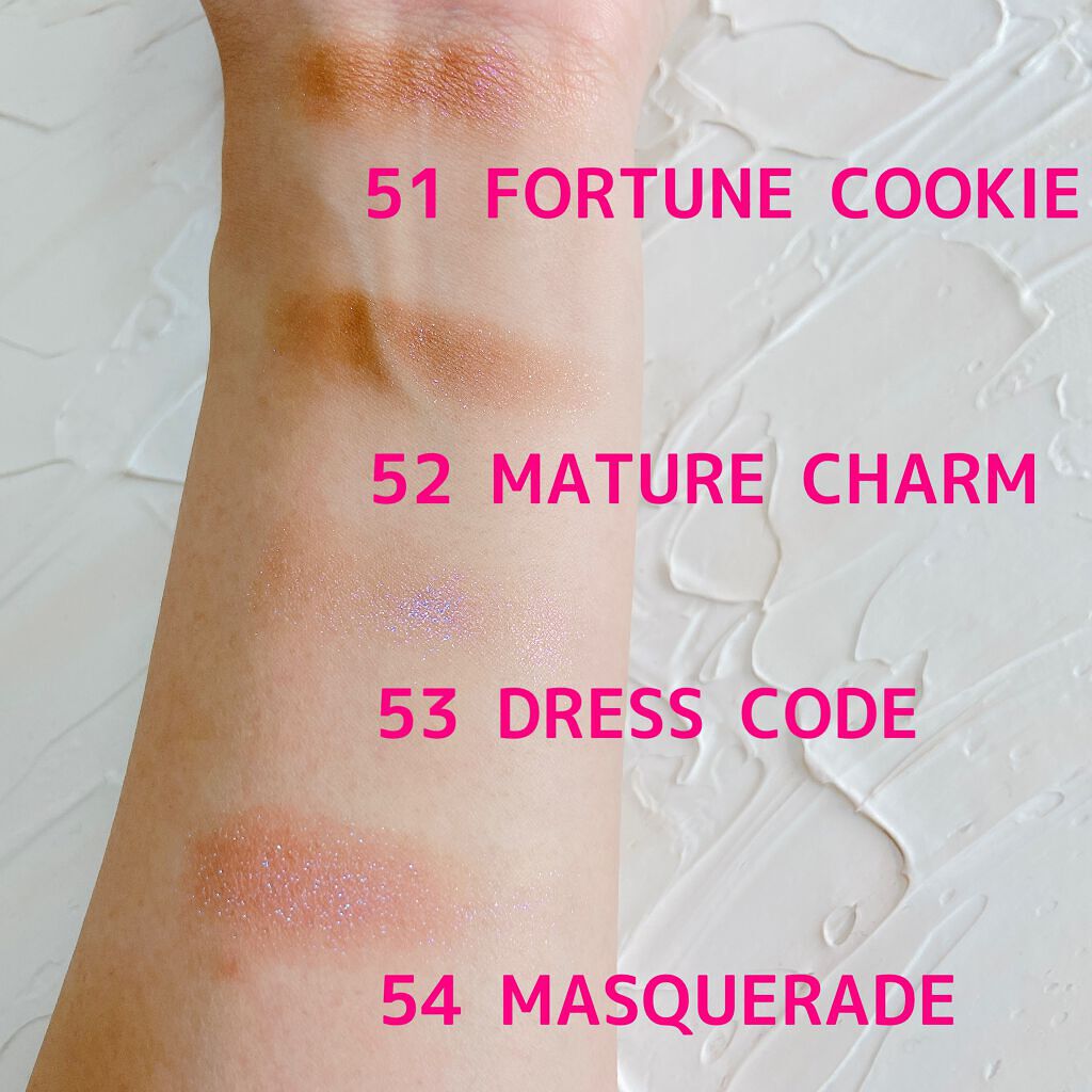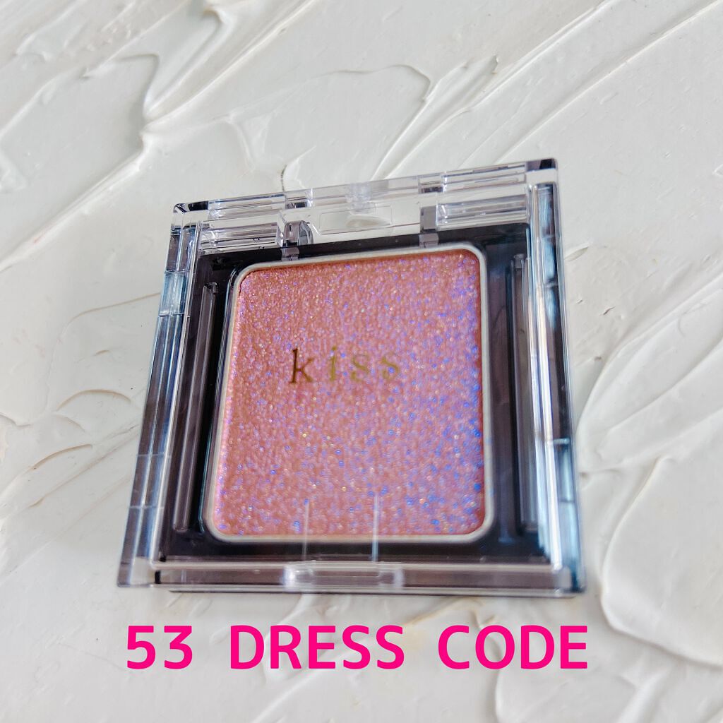 KiSSシアーグリッターアイズN51DRESSCODE(ドレスコード)主に青ラメが目立つ中、ゴールドのラメも潜んでます。一見すると濃い色合いですが、ピンクベージュに発色。画像6枚目、かなり濃く塗ったらネオンみたいな輝きになった。普通にメイクし...