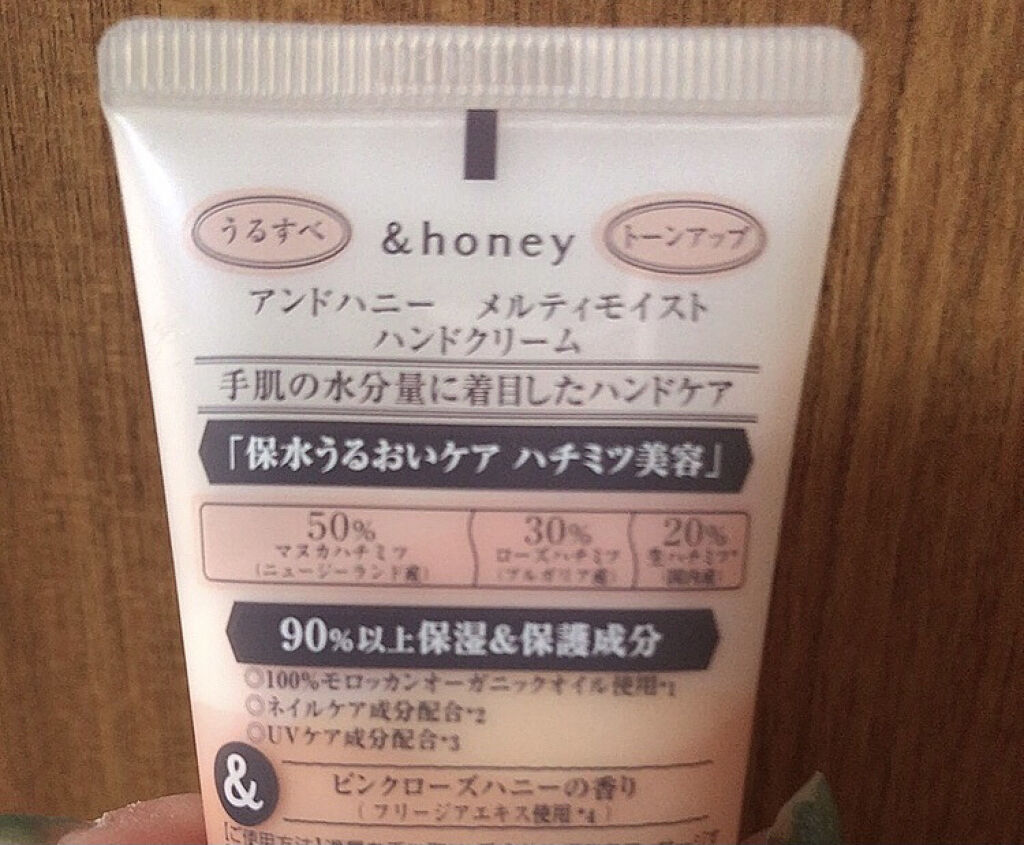 - <アンドハニー メルティモイスト ハンドクリーム> 水、BG、グリセリン、オリーブ果実油、トリエチルヘキサノイン、アラキジルアルコール、ジメチコン、ベヘニルアルコール、ハチミツ、加水分解ハチミツタンパク、グルコノバクター/ハチミツ発酵液、ミツロウ、セレブロシド、ローヤルゼリーエキス、加水分解ローヤルゼリーエキス、シア脂、フリージアエキス、アルガニアスピノサ核油、ケラチン(羊毛)、ヒアルロン酸ヒドロキシプロピルトリモニウム、水添ヤシ油、パーム油、レウコノストック/ダイコン根発酵液、シアノコバラミン、シクロペンタシロキサン、イソヘキサデカン、ダイマージリノール酸(フィトステリル/イソステアリル/セチル/ステアリル/ベヘニル)、カルボマー、アラキルグルコシド、ポリソルベート80、ポリメタクリル酸メチル、水酸化Na、ペンテト酸5Na、(アクリル酸Na/アクリロイルジメチルタウリンNa)コポリマー、(アクリレーツ/アクリル酸アルキル(C10-30))クロスポリマー、ペンチレングリコール、エチルヘキシルグリセリン、トコフェロール、キサンタンガム、フェノキシエタノール、シリカ、香料