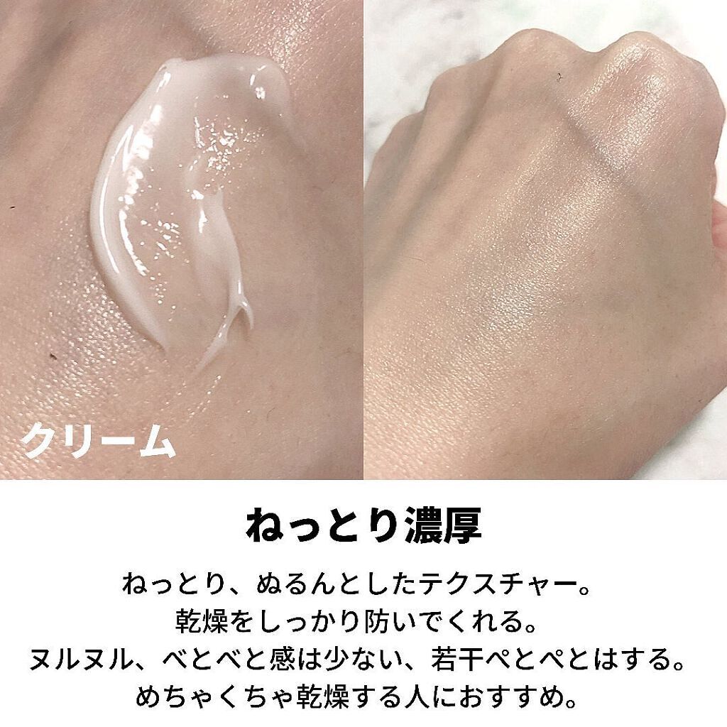 化粧水は白っぽい色で少しとろみがありました。 化粧水も乳液もベタつかないのにしっかり保湿力があるので使いやすいです。 液も少しずつしか出ないので、出しすぎることもなく無駄なく使えます。 レチノール配合ですが、特にヒリヒリすることもなかったです。 よかったら参考にしてください!