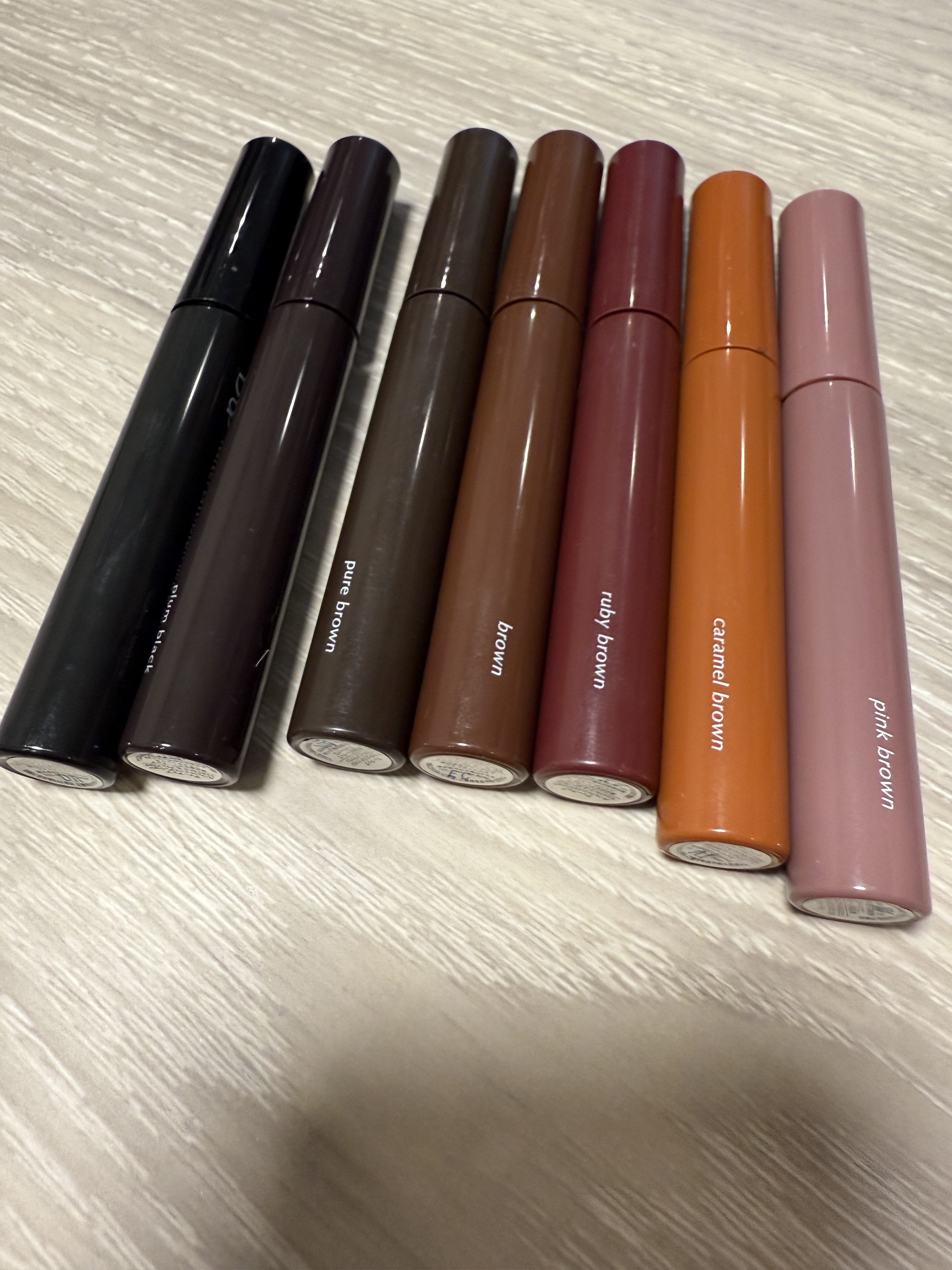 豊富なカラーからの3色購入。キャラメルブラウン、ルビーブラウン、チェリーブラウン ルビーブラウン ほどよいバーガンディブラウン。ブラウンにもピンクにも合うおしゃれな色です。 サラッといまどきな仕上がりなので、なんか盛りすぎちゃうアラサーには本当におすすめです。