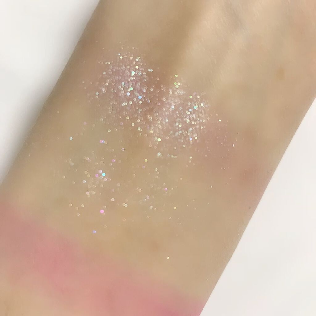 お値段は一つ300円。破格ですね。 色は06のプラネットシャドウと03のエメラルドティアーズを購入しました。 06のプラネットシャドウは濃い青色をしたグリッターになっています。手に塗ってみると青ラメとスパンコールがぎっしり入っていてまさに宇宙という感じがしました。 こちらのグリッター思ったよりべったりくっつくことはなく、ほんの少ししかつかないので涙袋など細かいところに塗るのにちょうど良いです。