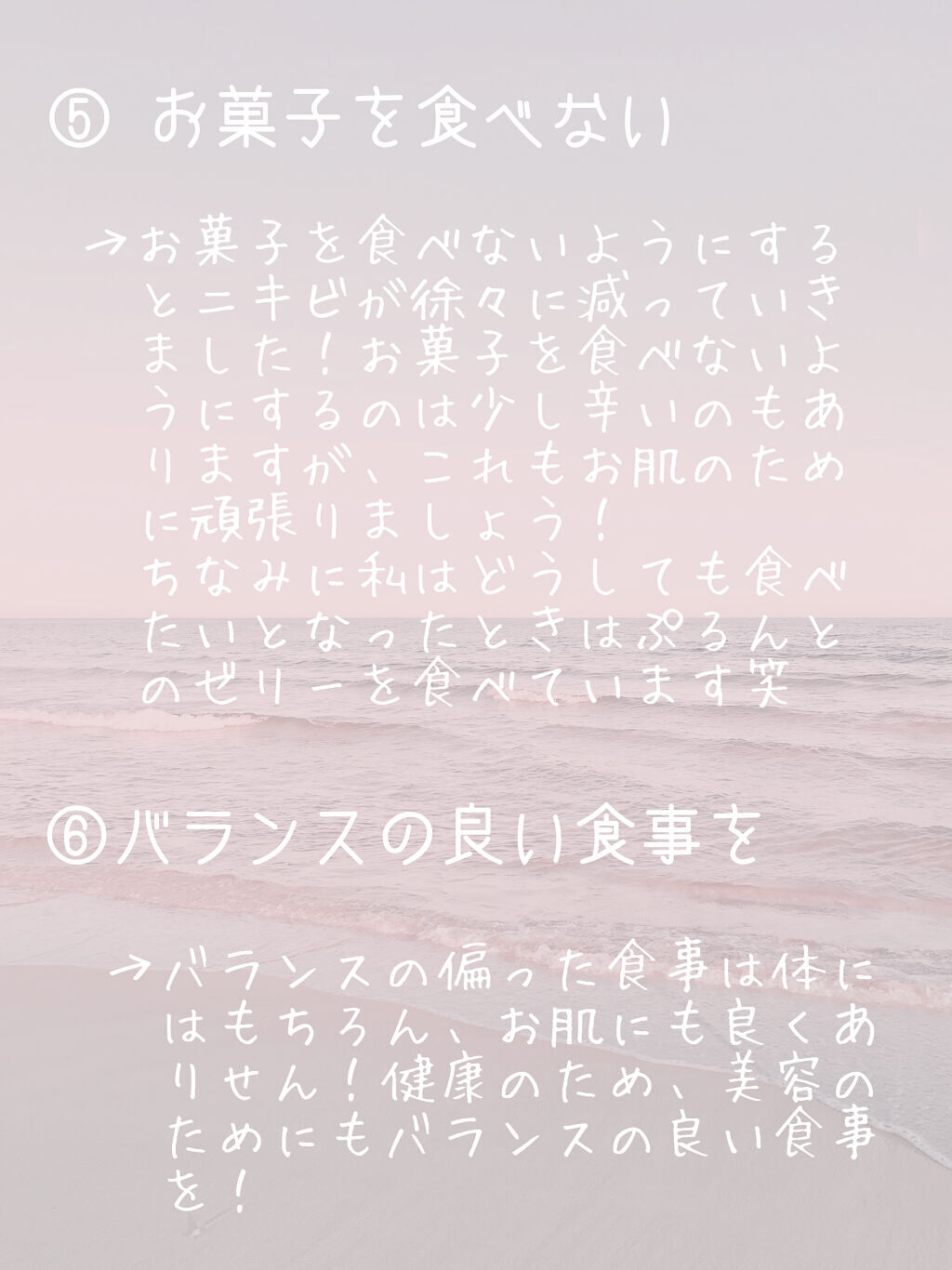 朝起きたらお水を飲む ビタミンCを取る 日焼け止めを毎日塗る 早寝早起き お菓子を食べない バランスの良い食事 シャワーを直接顔に当てない 顔はバスタオルで拭かない 家に帰ったら前髪を縛る 顔を触らない 適度な運動をする 枕カバーを毎日変える 寝る直前にスマホを見ない