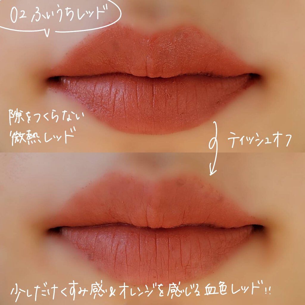 - 「温度を感じる、厚みの唇。」 雲タッチな質感×ティント処方×保湿成分配合の"1本3役のマットリップ" シルキー感触のむっちりふわふわ雲ティントで、唇に柔らかく密着するのにべとつかない。 保湿美容成分(植物性オイル配合)でしっかり潤いをキープしながら表面を揮発させ「乾燥しずらいのにマットな質感」に。