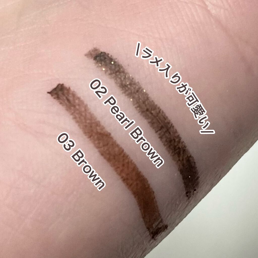 - <01 ブラック> 酸化鉄、トリメチルシロキシケイ酸、シクロペンタシロキサン、メチルトリメチコン、ポリエチレン、セレシン、カルナウバロウ、セタノール、(アクリレーツ/アクリル酸ステアリル/メタクリル酸ジメチコン)コポリマー、リンゴ酸ジイソステアリル、カーボンブラック <02 パールブラウン> トリメチルシロキシケイ酸、酸化鉄、シクロペンタシロキサン、メチルトリメチコン、ポリエチレン、マイカ、セレシン、ホウケイ酸(Ca/チタン)、合成ワックス、カルナウバロウ、トリイソステアリン酸ポリグリセリル-2、酸化チタン、セタノール、(アクリレーツ/アクリル酸ステアリル/メタクリル酸ジメチコン)コポリマー、ジメチコン、メチコン、酸化スズ <03 ブラウン> トリメチルシロキシケイ酸、酸化鉄、メチルトリメチコン、シクロペンタシロキサン、ポリエチレン、セレシン、マイカ、合成ワックス、カルナウバロウ、セタノール、(アクリレーツ/アクリル酸ステアリル/メタクリル酸ジメチコン)コポリマー、トリイソステアリン酸ポリグリセリル-2、酸化チタン、ジメチコン、メチコン、ポリイソブテン