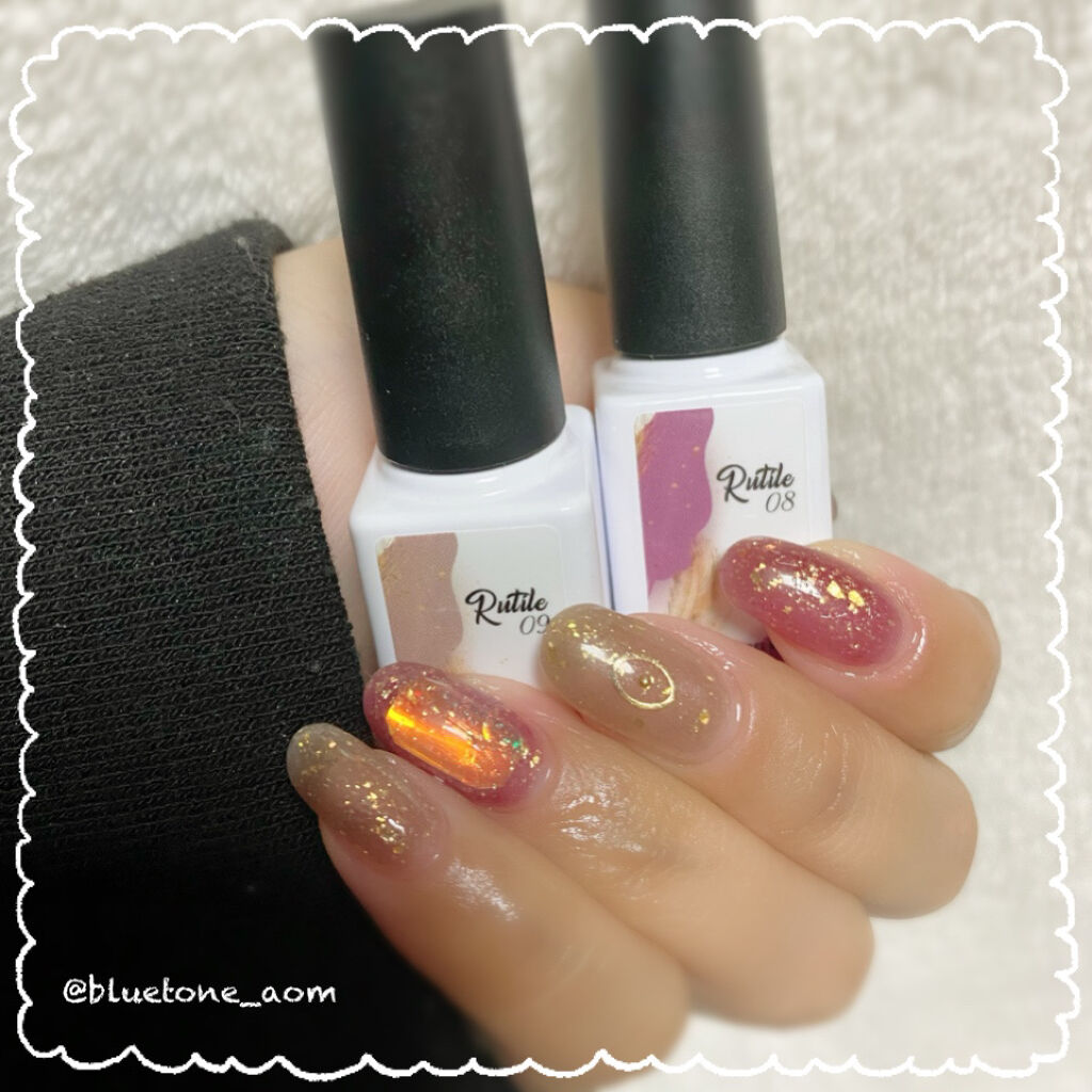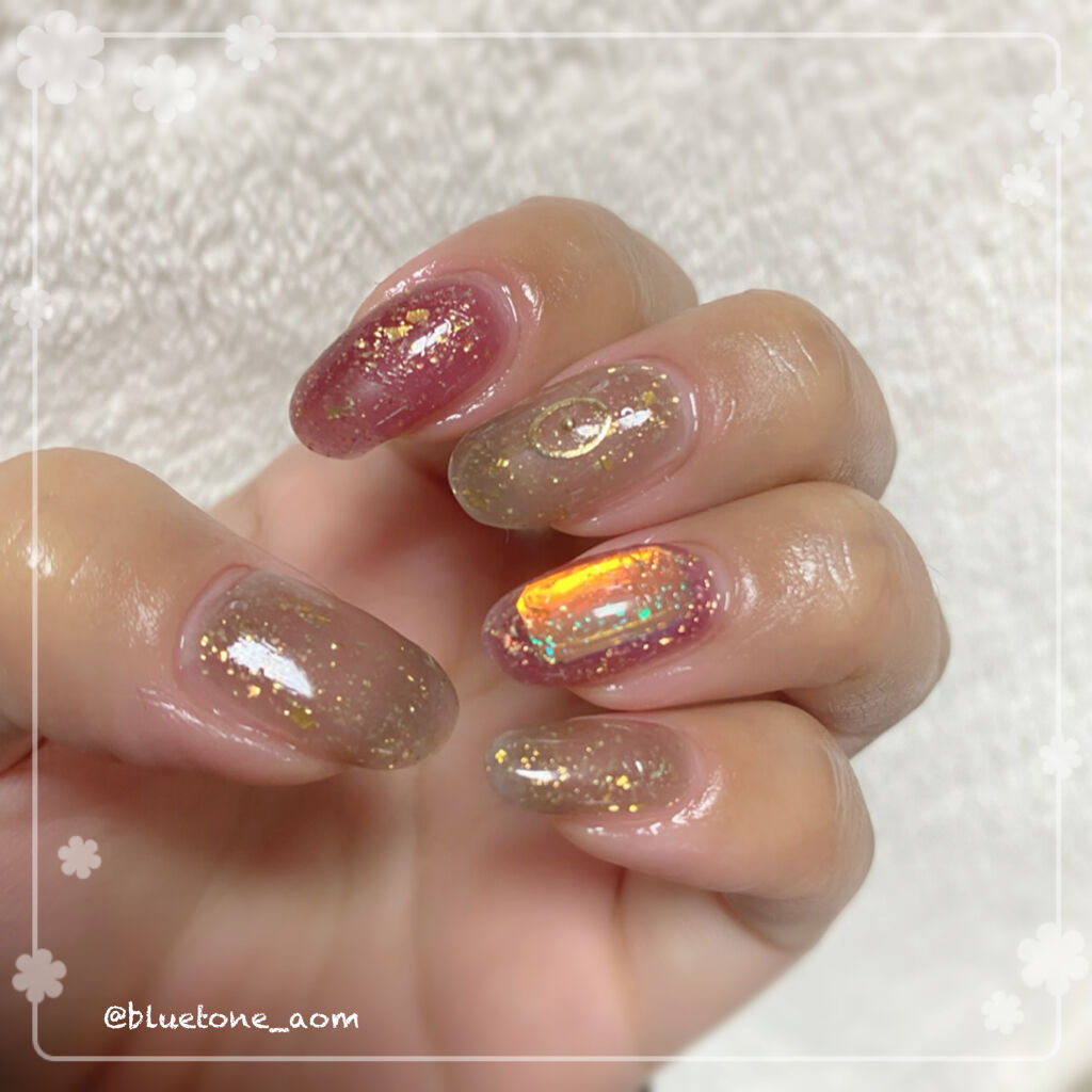 ラメがしっかりしてるし クリアカラーが入ってるから オーロラパウダー無しでも 充分キラキラしました! 反射強めのフィルムなので 実物はもっと うるうるとキラキラが強いです! ビー玉みたい🥺 ネイルシール長持ちさせたいけど ちょっと飽きてきたな〜って時とかに 全然違った印象になるのでオススメです! Seriaのベースジェル 本当にうるうるネイルしやすいので オススメしたい🙆♀️