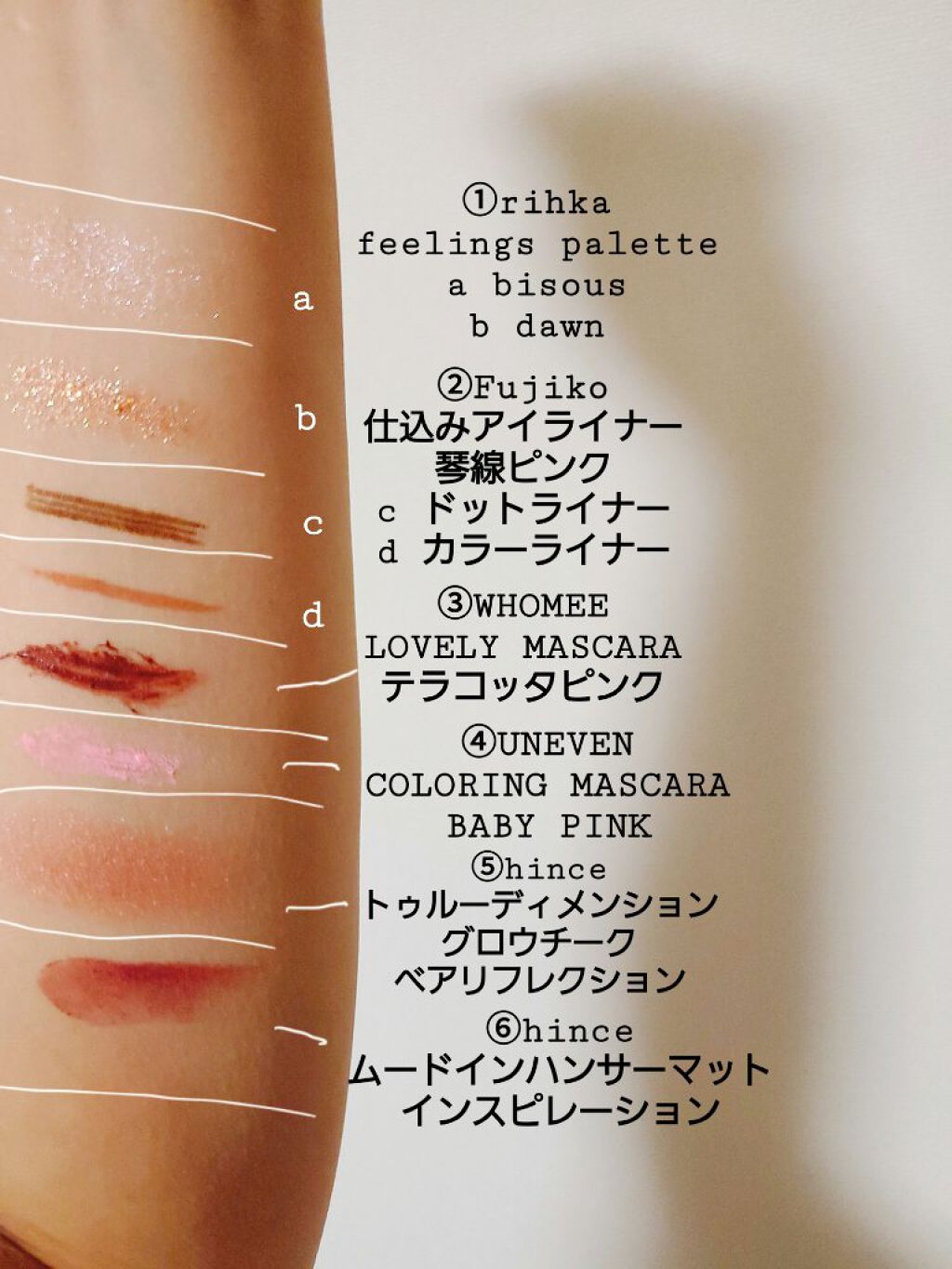 アイブロウは#whomeeのレッドブラウンを使用。 アイメイクは①#アンドビーの#クリームアイシャドウ マスタードを上下の瞼に。 アイメイクは②#misshaの#グリッタープリズムシャドウマーブル #ストームプリズムを①に重ねて。 下瞼は全体ではなく、黒目下にだけ✨ アイメイクは③#hinceの#ニューアンビエンスカラーアイライナー #エクレクティックを4枚目のように三角形に入れる。 チークは⑤#bisouの#ダイヤモンドグロウ マーズをほんのり✨ リップは⑥①のマスタードを塗った後に#celvokeの#エンスロールマットリップス 03を💋