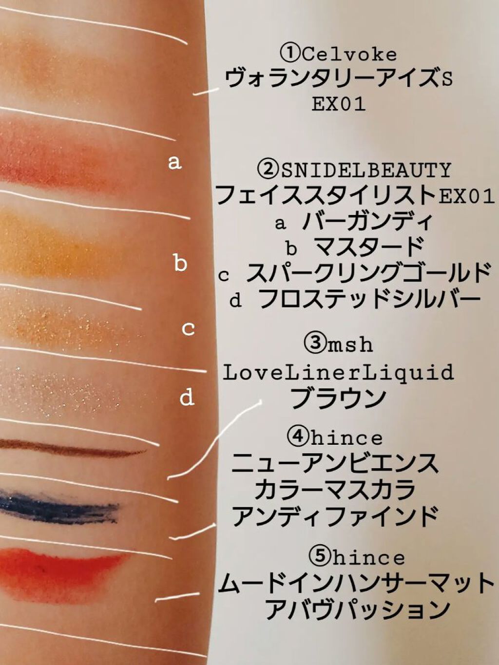 アイブロウは#whomeeのレッドブラウンを使用。 アイメイクは①#アンドビーの#クリームアイシャドウ マスタードを上下の瞼に。 アイメイクは②#misshaの#グリッタープリズムシャドウマーブル #ストームプリズムを①に重ねて。 下瞼は全体ではなく、黒目下にだけ✨ アイメイクは③#hinceの#ニューアンビエンスカラーアイライナー #エクレクティックを4枚目のように三角形に入れる。 チークは⑤#bisouの#ダイヤモンドグロウ マーズをほんのり✨ リップは⑥①のマスタードを塗った後に#celvokeの#エンスロールマットリップス 03を💋