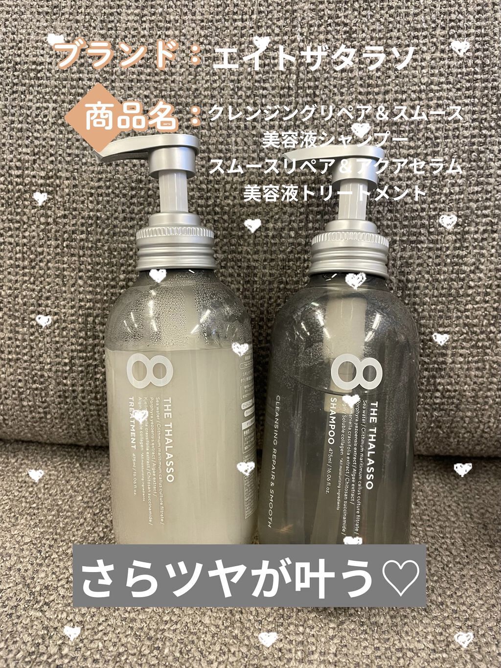 手ぐしでもコームでも引っかからないくらいサラサラヘアに変身しました♡ 匂いもきつくなく、フローラル系の匂いなので使いやすいとおもいます! エイトザタラソのシャンプーリンスです🫧 クレンジングリペア&スムース 美容液シャンプー/スムースリペア&アクアセラム 美容液トリートメント