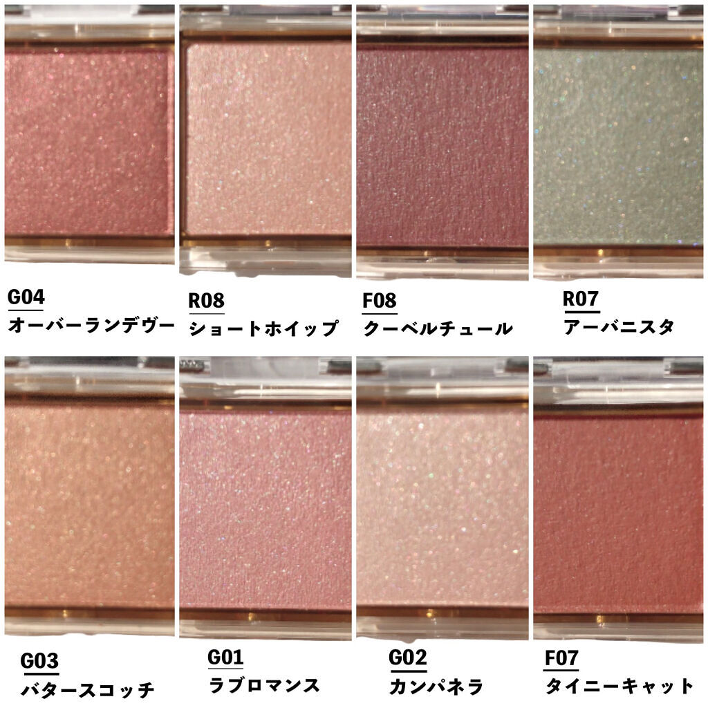- 【全成分表示】 タルク、トリエチルヘキサノイン、リンゴ酸ジイソステアリル、イソステアリン酸水添ヒマシ油、ポリグリセリル-3ポリジメチルシロキシエチルジメチコン、ラウリン酸亜鉛、スクワラン、トコフェロール、メチルパラベン、(+/-)グンジョウ、シリカ、ホウケイ酸(Ca/Al)、マイカ、金、銀、酸化スズ、酸化チタン、酸化鉄、赤226" 【R01~R06共通】 タルク、トリエチルヘキサノイン、リンゴ酸ジイソステアリル、イソステアリン酸水添ヒマシ油、ポリグリセリル-3ポリジメチルシロキシエチルジメチコン、ラウリン酸亜鉛、スクワラン、トコフェロール、メチルパラベン、(+/-)グンジョウ、シリカ、ホウケイ酸(Ca/Al)、マイカ、酸化スズ、酸化チタン、酸化鉄、赤202、赤226" 【D01~D04共通】 ジメチコン、リンゴ酸ジイソステアリル、タルク、アルキル(C26-28)ジメチコン、(ジメチコン/ビニルジメチコン)クロスポリマー、スクワラン、カルナウバロウ、PEG-10ジメチコン、ポリメタクリル酸メチル、(+/-)グンジョウ、コンジョウ、ホウケイ酸(Ca/Al)、マイカ、酸化チタン、酸化鉄、水酸化Al" 【F01~F06共通】 ジメチコン、アルキル(C26-28)ジメチコン、(ジメチコン/ビニルジメチコン)クロスポリマー、リンゴ酸ジイソステアリル、スクワラン、PEG-10ジメチコン、ポリメタクリル酸メチル、カルナウバロウ、(+/-)グンジョウ、マイカ、黄4、酸化チタン、酸化鉄、水酸化Al、赤226" 【G01~G04共通】 タルク、合成フルオロフロゴパイト、トリエチルヘキサノイン、リンゴ酸ジイソステアリル、イソステアリン酸水添ヒマシ油、スクワラン、トコフェロール、ラウリン酸亜鉛、メチルパラベン、(+/-)マイカ、酸化チタン、酸化鉄、赤226